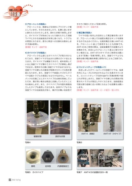 3)アローハットの取扱いアローハットは、絶縁などを目的にプラスチック製としています。そのため劣化したり、乱暴に扱いますと割れたり欠けたりします。割れた状態で使用しますと、ガイドパイプが斜めになったり揺れたりして溶接ワイヤにかかる送給抵抗が非常に高くなり、トラブルの原因になります。直ちに新品への交換をお勧めします(写真4参照)。【影響】キンク・送給不良4)ガイドパイプの取扱いアローパックの上部にはガイドパイプが取り付けられており、溶接ワイヤが引出される際のガイド役となります。ガイドパイプは鋼製ですので、経年使用していると溶接ワイヤが擦れてガイドパイプが摩耗し溝ができます。使用中その溝に溶接ワイヤがはまりますと、溶接ワイヤの捩じれの解放が阻害されキンクの発生要因になります。また、溶接ワイヤ表面にキズが入りワイヤ送給トラブルの原因にもなりかねません。ペールパックの交換ごとにガイドパイプの点検を実施していただき、溝が深い場合は新品に交換していただくことをお勧めします。また、ガイドパイプの内面を樹脂加工したタイプも販売しております。従来タイプよりも溶接ワイヤの送給抵抗が低く、傷が付き難い改良型ですのでご検討ください(写真5参照)。【影響】キンク・送給不良5)矯正機の取扱いワイヤの狙い性向上を目的として矯正機を用いますが、アローハット直上での過度な矯正はキンクを誘発するのでお止めください。比較的矯正の強いAMT-KSを、アローハット直上で使用することも同様です。AMT-KSをご使用の際は、送給装置側での設置がより効果的です。状況によりアローハット直上に取り付けたい場合には、AMT-KF(Hタイプ)のご使用をお願いします(写真6・写真7参照)。また、溶接ワイヤよりも細系仕様の矯正機を無理に使用することもご法度です。【影響】キンク・送給不良6)コンジットチューブの取扱い(1)前述しましたがペールパックの溶接ワイヤは、鉛直方向にスムーズに引き出されるように生産されています。コンジットチューブの折れ曲がり(写真8参照)や捩じれが存在しますと、溶接ワイヤの捩じれの開放が阻害されトラブルが発生しやすくなります。送給経路は可能な限り直線に近い状態になるような設置をお願いします。【影響】キンク・送給不良・ビード蛇行・狙いずれ過度な矯正破損状態良好な状態AMT-K(廃版)AMT-KF(Hタイプ)写真4写真6摩耗従来型内面樹脂加工写真5ガイドパイプ写真7AMT-KSの設置状況の一例172022Spring