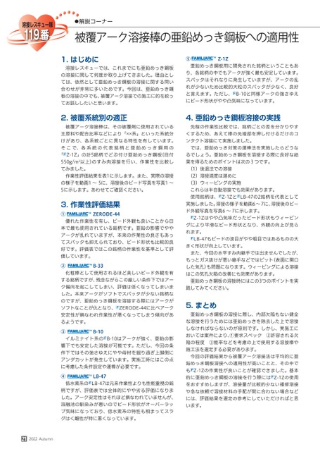 ●解説コーナー被覆アーク溶接棒の亜鉛めっき鋼板への適用性1.はじめに溶接レスキューでは、これまでにも亜鉛めっき鋼板の溶接に関して何度か取り上げてきました。理由としては、依然として亜鉛めっき鋼板の溶接に関する問い合わせが非常に多いためです。今回は、亜鉛めっき鋼板の溶接の中でも、被覆アーク溶接での施工に的を絞ってお話ししたいと思います。2.被覆系統別の適正被覆アーク溶接棒は、その被覆剤に使用されている主原料や配合比率などにより「系」といった系統分けがあり、各系統ごとに異なる特性を有しています。そこで、各系統の代表銘柄と亜鉛めっき鋼用の「Z-1Z」の計5銘柄でどぶ付け亜鉛めっき鋼板(目付550g/m2以上)のすみ肉溶接を行い、作業性を比較してみました。作業性評価結果を表1に示します。また、実際の溶接の様子を動画1〜5に、溶接後のビード写真を写真1〜5に示します。あわせてご確認ください。3.作業性評価結果①ZERODE-44優れた作業性を有し、ビード外観も良いことから日本で最も使用されている銘柄です。亜鉛の影響でややアークが乱れていますが、本来の作業性の良さもあってスパッタも抑えられており、ビード形状も比較的良好です。評価表ではこの銘柄の作業性を基準として評価しています。②B-33化粧棒として使用されるほど美しいビード外観を有する銘柄ですが、残念ながらこの厳しい条件下ではアーク偏向を起こしてしまい、評価は低くなってしまいました。本来アークがソフトでスパッタが少ない銘柄なのですが、亜鉛めっき鋼板を溶接する際にはアークがソフトなことが仇となり、ZERODE-44に比べアーク安定性が損なわれ作業性が悪くなってしまう傾向があるようです。③B-10イルミナイト系のB-10はアークが強く、亜鉛の影響下でも安定した溶接が可能です。ただし、今回の条件下ではその強さゆえにやや母材を掘り過ぎ上脚側にアンダカットが発生しています。実施工時にはこの点に考慮した条件設定や運棒が必要です。④LB-47低水素系のLB-47は元来作業性よりも性能重視の銘柄ですが、評価表では全体的にやや劣る評価になりました。アーク安定性はそれほど損なわれていませんが、溶融池の馴染みが悪いのでビード形状がオーバーラップ気味になっており、低水素系の特性も相まってスラグはく離性が特に悪くなっています。⑤Z-1Z亜鉛めっき鋼板用に開発された銘柄ということもあり、各銘柄の中でもアークが強く最も安定しています。スパッタはそれなりに発生していますが、アークの乱れが少ないため比較的大粒のスパッタが少なく、良好と言えます。ただし、B-10と同様アークの強さゆえにビード形状がやや凸気味になっています。4.亜鉛めっき鋼板溶接の実践先程の作業性比較では、銘柄ごとの差を分かりやすくするため、あえて棒の先端部を押し付けるだけのコンタクト溶接にて実施しました。では、亜鉛めっき対策の運棒法を実施したらどうなるでしょう。亜鉛めっき鋼板を溶接する際に良好な結果を得るためのポイントは次の3つです。(1)後退法での溶接(2)溶接速度は遅めに(3)ウィービングの実施これらは半自動溶接でも効果があります。使用銘柄は、Z-1ZとLB-47の2銘柄を代表として実施しました。溶接の様子を動画6〜7に、溶接後のビード外観写真を写真6〜7に示します。Z-1Zはやや凸気味だったビード形状もウィービングにより平滑なビード形状となり、外観の向上が見られます。LB-47もビードの波目がやや粗目ではあるものの大きく形状が向上しています。また、今回の水平すみ肉継手では出ませんでしたが、もっとガス抜けが悪い継手などではピット(表面に開口した気孔)も問題になります。ウィービングによる溶接はこの気孔欠陥の改善にも効果があります。亜鉛めっき鋼板の溶接時にはこの3つのポイントを実践してみてください。5.まとめ亜鉛めっき鋼板の溶接に際し、内部欠陥もない健全な溶接を行うためには亜鉛めっきを除去した上で溶接しなければならないのが原則です。しかし、実施工においては案件により、①要求スペック②許容される欠陥の程度③能率などを考慮の上で使用する溶接棒や施工法を選定する必要があります。今回の評価結果から被覆アーク溶接法は平均的に亜鉛めっき鋼板溶接への適用性が高いことと、その中でもZ-1Zの作業性が良いことが確認できました。基本的に亜鉛めっき鋼板の溶接を行う際にはZ-1Zの使用をおすすめしますが、溶接量が比較的少ない補修溶接や急な依頼で溶接材料の手配が間に合わない場合などには、評価結果を選定の参考にしていただければと思います。212022Autumn