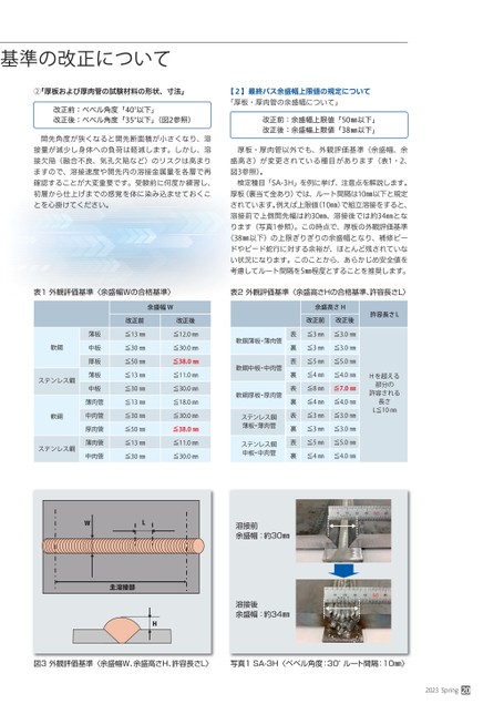 基準の改正について②「厚板および厚肉管の試験材料の形状、寸法」改正前:ベベル角度「40以下」改正後:ベベル角度「35以下」(図2参照)開先角度が狭くなると開先断面積が小さくなり、溶接量が減少し身体への負荷は軽減します。しかし、溶接欠陥(融合不良、気孔欠陥など)のリスクは高まりますので、溶接速度や開先内の溶接金属量を各層で再確認することが大変重要です。受験前に何度か練習し、初層から仕上げまでの感覚を体に染み込ませておくことを心掛けてください。【2】最終パス余盛幅上限値の規定について「厚板・厚肉管の余盛幅について」改正前:余盛幅上限値「50㎜以下」改正後:余盛幅上限値「38㎜以下」厚板・厚肉管以外でも、外観評価基準(余盛幅、余盛高さ)が変更されている種目があります(表1・2、図3参照)。検定種目「SA-3H」を例に挙げ、注意点を解説します。厚板(裏当て金あり)では、ルート間隔は10㎜以下と規定されています。例えば上限値(10㎜)で組立溶接をすると、溶接前で上側開先幅は約30㎜、溶接後では約34㎜となります(写真1参照)。この時点で、厚板の外観評価基準(38㎜以下)の上限ぎりぎりの余盛幅となり、補修ビードやビード蛇行に対する余裕が、ほとんど残されていない状況になります。このことから、あらかじめ安全値を考慮してルート間隔を5㎜程度とすることを推奨します。表1外観評価基準〈余盛幅Wの合格基準〉表2外観評価基準〈余盛高さHの合格基準、許容長さL〉余盛幅W軟鋼ステンレス鋼軟鋼ステンレス鋼薄板中板厚板薄板中板薄肉管中肉管厚肉管薄肉管中肉管改正前≦13㎜≦30㎜≦50㎜≦13㎜≦30㎜≦13㎜≦30㎜≦50㎜≦13㎜≦30㎜改正後≦12.0㎜≦30.0㎜≦38.0㎜≦11.0㎜≦30.0㎜≦18.0㎜≦30.0㎜≦38.0㎜≦11.0㎜≦30.0㎜余盛高さH改正前改正後≦3㎜≦3.0㎜≦3㎜≦3.0㎜≦5㎜≦5.0㎜≦4㎜≦4.0㎜≦8㎜≦7.0㎜≦4㎜≦4.0㎜≦3㎜≦3.0㎜≦3㎜≦3.0㎜≦5㎜≦5.0㎜≦4㎜≦4.0㎜軟鋼薄板・薄肉管軟鋼中板・中肉管軟鋼厚板・厚肉管ステンレス鋼薄板・薄肉管ステンレス鋼中板・中肉管表裏表裏表裏表裏表裏許容長さLHを超える部分の許容される長さL≦10㎜WL溶接前余盛幅:約30㎜主溶接部H溶接後余盛幅:約34㎜図3外観評価基準〈余盛幅W、余盛高さH、許容長さL〉写真1SA-3H〈ベベル角度:30°ルート間隔:10㎜〉2023Spring20