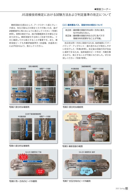 JIS溶接技術検定における試験方法および判定基準の改正について●解説コーナー補修溶接の注意点として、アークスタート部とクレータ部は、気孔欠陥などの発生リスクが高いため、曲げ試験範囲内に残らないように施工してください(写真5参照)。実際の検定では、曲げ試験範囲を示す線などはありません。補修溶接をする前にご自身で計測し、十分に確認してから施工することが重要です。また、補修溶接ビードも外観評価基準内(余盛幅、余盛高さ)に必ず収まるよう、施工してください。【2】最終層各パス、溶接方向の規定について改正前:最終層の溶接方向は同一方向に揃えなければならない。改正後:最終層の溶接方向ならびに各パスで溶接方向を変更することが可能。改正前は同一方向に溶接するため、始終端部にてオーバラップ・アンダカット・垂れ落ちなどが発生しやすい状況でした(写真6参照)。改正後は溶接方向が自由に選択できるため、始終端部のビード形状・外観を整えながら、施工することが可能になりました。ぜひお試しください(写真7参照)。【部分補修例】【端部補修例】半自動溶接被覆アーク溶接半自動溶接被覆アーク溶接補修前補修前補修前補修前補修後補修方向補修後補修後補修後補修方向補修方向写真2部分的な補修例写真3部分的な補修例【ポイント】アークスタート、クレータは表曲げ試験範囲外へ!〇表曲げ試験範囲〇××立向上進補修立向下進補修立向下進補修【立向下進溶接補修例】半自動溶接被覆アーク溶接写真4部分的な補修例写真5補修溶接の範囲SA-2H端部形状不良オーバラップ溶接方向(同一方向)アンダカットSA-2H端部形状良好溶接方向(交互方向)ビード形状良好写真6同一方向のビード外観例写真7交互方向のビード外観例2023Spring22