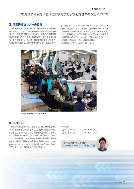 JIS溶接技術検定における試験方法および判定基準の改正について●解説コーナー3.溶接研修センターの紹介当社溶接研修センターは(株)神戸製鋼所藤沢事業所内に併設されており、毎月JIS溶接技能者評価試験受験コース(以下JIS受験コースという)を中心に各種溶接研修を開催しております。JIS受験コースで特筆すべきは、数日間練習したブース・溶接電源で受験が可能で、年間合格率は90%と高い数値を誇っていることです。JIS受験コースに加え、溶接入門コース(アーク特別教育終了証発行)・ボイラー溶接士受験対策コース・外国人技能実習生向け実技コースなども随時開催中です。また、受講者のニーズに応えるオーダーメイド研修や出張研修も行っていますので、ご興味のある方はぜひお気軽にご相談ください(写真8参照)。溶接研修センター0466-20-3020写真8研修センター指導風景4.おわりに今回は検定に関わる主な改正点と、施工時の注意点について解説させていただきました。皆様の合格の一助になりましたら幸いです。より詳細な改正内容につきましては、最新の検定基準(JIS・WES)をご確認ください。また、受験会場により多少ルールが異なる場合が予想されます。事前に受験される会場にご確認されることをお勧めいたします。その他、溶接に関するご不明な点などございましたら、お気軽にご相談ください。参考文献1)JISZ3801:20183)WES8201:20212)JISZ3841:20184)WES8241:2021コベルコ溶接テクノ株式会社CS推進部CSグループ秋山了亮2023Spring24
