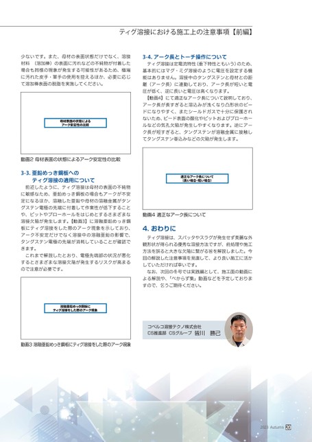 ティグ溶接における施工上の注意事項【前編】少ないです。また、母材の表面状態だけでなく、溶接材料(溶加棒)の表面に汚れなどの不純物が付着した場合も同様の現象が発生する可能性があるため、極端に汚れた皮手・軍手の使用を控えるほか、必要に応じて溶加棒表面の脱脂を実施してください。3-4.アーク長とトーチ操作についてティグ溶接は定電流特性(垂下特性ともいう)のため、基本的にはマグ・ミグ溶接のように電圧を設定する機能はありません。溶接中のタングステンと母材との距離(アーク長)に連動しており、アーク長が短いと電圧が低く、逆に長いと電圧は高くなります。【動画4】にて適正なアーク長について説明しており、アーク長が長すぎると溶込みが浅くなり凸形状のビードになりやすく、またシールドガスで十分に保護されないため、ビード表面の酸化やピットおよびブローホールなどの気孔欠陥が発生しやすくなります。逆にアーク長が短すぎると、タングステンが溶融金属に接触してタングステン巻込みなどの欠陥が発生します。動画2母材表面の状態によるアーク安定性の比較3-3.亜鉛めっき鋼板へのティグ溶接の適用について前述したように、ティグ溶接は母材の表面の不純物に敏感なため、亜鉛めっき鋼板の場合もアークが不安定になるほか、溶融した亜鉛や母材の溶融金属がタングステン電極の先端に付着して作業性が低下することや、ピットやブローホールをはじめとするさまざまな溶接欠陥が発生します。【動画3】に溶融亜鉛めっき鋼板にティグ溶接をした際のアーク現象を示しており、アーク不安定だけでなく溶接中の溶融亜鉛の影響で、タングステン電極の先端が消耗していることが確認できます。これまで解説したとおり、電極先端部の状況が悪化するとさまざまな溶接欠陥が発生するリスクが高まるので注意が必要です。動画4適正なアーク長について4.おわりにティグ溶接は、スパッタやスラグが発生せず美麗な外観形状が得られる優秀な溶接方法ですが、前処理や施工方法を誤ると大きな欠陥に繋がる旨を解説しました。今回の解説した注意事項を見直して、より良い施工に活かしていただければ幸いです。なお、次回の冬号では実践編として、施工面の動画による解説や、「べからず集」動画などを予定しておりますので、乞うご期待ください。動画3溶融亜鉛めっき鋼板にティグ溶接をした際のアーク現象コベルコ溶接テクノ株式会社CS推進部CSグループ皆川勝己2023Autumn20