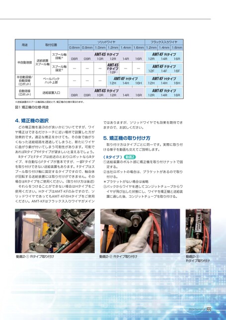 用途取付位置ソリッドワイヤフラックス入りワイヤ0.8mm0.9mm1.0mm1.2mm1.4mm1.6mm1.2mm1.4mm1.6mm半自動溶接送給装置スプール軸スプール軸回転※スプール軸固定※半自動溶接/自動溶接(ロボット)自動溶接(ロボット)ペールパックハット上部送給装置入口08R09R10R12R14R16R12R14R16R――――――――12F14F16F12H14H16H12H14H16H08R09R10R12R14R16R12R14R16R※送給装置のスプール軸回転と固定とで、矯正機の仕様が異なります。図1矯正機の仕様・用途4.矯正機の選択どの矯正機を選ぶのが良いかについてですが、ワイヤ矯正はできるだけトーチに近い場所で設置した方が効果的です。適正な矯正をかけても、その後で曲がりくねった送給経路を通過してしまうと、新たにワイヤに曲がり癖が付いてしまう可能性があります。可能であればRタイプやFタイプが望ましいと言えるでしょう。RタイプとFタイプは前述のとおりロボットならRタイプ、半自動ならFタイプが基本ですが、一部Fタイプを取り付けできない送給装置もあります。Fタイプはスプール取り付け軸に固定するタイプですので、軸自体が回転する送給装置には取り付けができません。その場合はRタイプをご使用ください。(取り付け方は後述)それらをつけることができない場合はHタイプをご使用ください。HタイプはAMT-KFのみですので、ソリッドワイヤであってもAMT-KFのHタイプをご使用ください。AMT-KFはフラックス入りワイヤがメインではありますが、ソリッドワイヤでも効果を期待できますので、お試しください。5.矯正機の取り付け方取り付け方はタイプごとに同一です。実際に取り付ける様子を動画も交えてご説明します。〈Rタイプ〉動画2①送給装置のボルト部に矯正機を取り付けナットで固定する。②当社ロボットの場合は、ブラケットがあるので取り付ける。*ブラケットがない場合は省略③パックからワイヤを通してコンジットチューブからワイヤが飛び出した状態にし、ワイヤを矯正機と送給装置に通した後、コンジットチューブを取り付ける。動画2-①Rタイプ取り付け動画2-②Rタイプ取り付け動画2-③Rタイプ取り付け2024Summer22