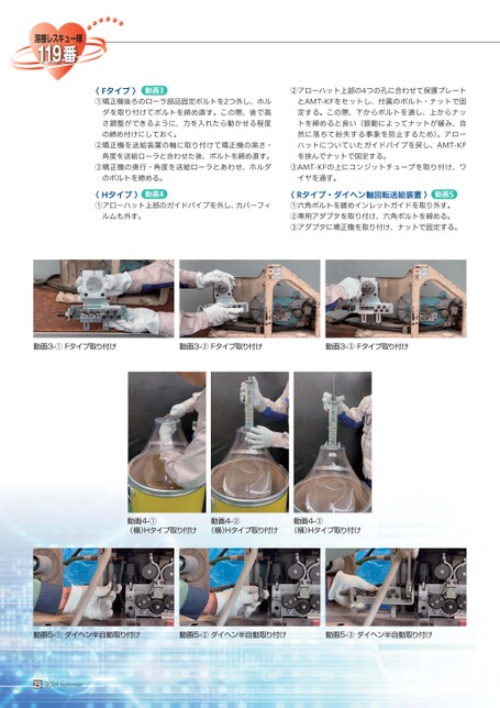 〈Fタイプ〉動画3①矯正機後ろのローラ部品固定ボルトを2つ外し、ホルダを取り付けてボルトを締め直す。この際、後で高さ調整ができるように、力を入れたら動かせる程度の締め付けにしておく。②矯正機を送給装置の軸に取り付けて矯正機の高さ・角度を送給ローラと合わせた後、ボルトを締め直す。③矯正機の奥行・角度を送給ローラとあわせ、ホルダ②アローハット上部の4つの孔に合わせて保護プレートとAMT-KFをセットし、付属のボルト・ナットで固定する。この際、下からボルトを通し、上からナットを締めると良い(振動によってナットが緩み、自然に落ちて紛失する事象を防止するため)。アローハットについていたガイドパイプを戻し、AMT-KFを挟んでナットで固定する。③AMT-KFの上にコンジットチューブを取り付け、ワのボルトを締める。イヤを通す。〈Hタイプ〉動画4①アローハット上部のガイドパイプを外し、カバーフィルムも外す。〈Rタイプ・ダイヘン軸回転送給装置〉動画5①六角ボルトを緩めインレットガイドを取り外す。②専用アダプタを取り付け、六角ボルトを締める。③アダプタに矯正機を取り付け、ナットで固定する。動画3-①Fタイプ取り付け動画3-②Fタイプ取り付け動画3-③Fタイプ取り付け動画4-①(横)Hタイプ取り付け動画4-②(横)Hタイプ取り付け動画4-③(横)Hタイプ取り付け動画5-①ダイヘン半自動取り付け動画5-②ダイヘン半自動取り付け動画5-③ダイヘン半自動取り付け232024Summer