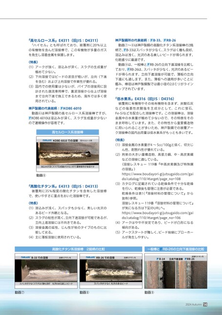 「高セルロース系」E4311(旧JIS:D4311)「ハイセル」とも呼ばれており、被覆剤に20%以上の有機物を含んだ溶接棒で、この有機物が多量のガスを発生し溶着金属を保護します。〈特長〉(1)アークが強く、溶込みが深く、スラグの生成量が極めて少ない。(2)下向溶接ではビードの波目が粗いが、立向(下進を含む)および上向溶接で作業性が優れる。(3)国内での使用量は少ないが、パイプの溶接用に設計された直流専用棒で、裏波溶接から仕上げ溶接まで立向下進で施工できるため、海外では多く使用されている。神戸製鋼の代表銘柄:KOBE-6010動画⑥は神戸製鋼の高セルロース系溶接棒ですが、KOBE-6010は溶込みが深く、スラグ生成量が少ないので運棒操作が容易です。高セルロース系溶接棒動画⑥「高酸化チタン系」E4313(旧JIS:D4313)被覆剤に35%程度の酸化チタンを含有した溶接棒で、使いやすさに重点をおいた溶接棒です。〈特長〉(1)溶込みが浅く、スパッタも少なく、美しい光沢のあるビード外観となる。(2)スラグの粘性が高く、立向下進溶接が可能であるが、神戸製鋼所の代表銘柄:B-33、RB-26動画⑦〜⑧は神戸製鋼の高酸化チタン系溶接棒の2銘柄で、B-33はスパッタが少なく、スラグはく離も良好、溶込みは浅く、光沢のある美しいビードが得られます。化粧盛りに最適です。動画⑨は、一般棒とRB-26の立向下進溶接を比較しており、RB-26は、スパッタが少なく、光沢のあるビードが得られます。立向下進溶接が可能で、薄板の立向下進にも適します。また、薄板への適用が多いことに鑑み、棒径は神戸製鋼製では最小径の2.0ミリがラインナップされています。「低水素系」E4316(旧JIS:D4316)被覆剤に有機物やその他有機物を含まず、炭酸石灰などの塩基性炭酸塩を主成分として、これに蛍石、Fe-Siなどを配合した溶接棒です。この溶接棒は、溶接金属中の水素量が極めて少ないので、その特徴をそのまま呼称しています。また、その特性から重要構造物に用いられることが多いため、神戸製鋼での被覆アーク溶接棒の国内出荷量は低水素系がもっとも多いです。〈特長〉(1)溶接金属の水素量が4〜5cc/100gと低く、切欠じん性、耐割れ性が優れている。(2)拘束の大きい重構造物、高張力鋼、中・高炭素鋼119番『中高炭素鋼及び特殊鋼などの溶接に適している。(溶接レスキューの溶接』)https://www.boudayori-gijutsugaido.com/gaido/catalog/110/#target/page_no=108(3)カタログに記載されている乾燥条件で十分な乾燥を行い、乾燥後も管理に注意が必要である。乾燥条件は表1(『溶接材料の管理について』から抜粋)参照。溶接レスキュー119番『溶接材料の管理について』が気になる方は下記のURLへ。https://www.boudayori-gijutsugaido.com/gaido/catalog/110/#target/page_no=106立向上進溶接には不向きである。(4)アークはやや不安定であり、ビードが凸形になる(3)溶接金属の延性、じん性が他のタイプのものに比傾向がある。較して劣る。(5)アークスタートが難しく、ビード始端にブローホー(4)主に薄板溶接に使用されている。ルが発生しやすい。高酸化チタン系溶接棒2銘柄の比較一般棒とRB-26の立向下進溶接の比較動画⑦動画⑧動画⑨2024Autumn14