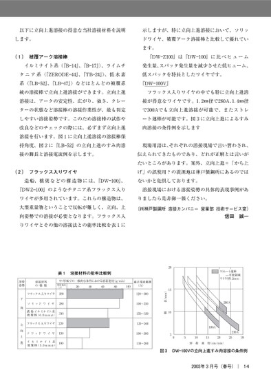年月号(春号)|14以下に立向上進溶接の得意な当社溶接材料を説明します。()被覆アーク溶接棒イルミナイト系(『B―』、『B―』)、ライムチタニア系(『ZERODE―』、『TB―』)、低水素系(『LB―』、『LB―』)などほとんどの被覆系統の溶接棒で立向上進溶接ができます。立向上進溶接は、アークの安定性、広がり、強さ、クレーターの状態など溶接棒の溶接作業性が、最も判定しやすい溶接姿勢です。このため溶接棒の試作や改良などのチェックの際には、必ずまず立向上進溶接を行います。図に立向上進溶接の溶接棒保持角度、図に『LB―』の立向上進のすみ肉溶接の脚長と溶接電流例を示します。()フラックス入りワイヤ造船、橋梁などの構造物には、『DW―』、『DWZ―』のようなチタニア系フラックス入りワイヤが多用されています。これらの構造物は、大型重量物ということで反転が難しく、立向、上向姿勢での溶接が必要となります。フラックス入りワイヤとその他の溶接法との能率比較を表に示しますが、特に立向上進溶接において、ソリッドワイヤ、被覆アーク溶接棒と比較して優れています。『DW―Z』は『DW―』に比べヒューム発生量、スパッタ発生量を減少させた低ヒューム、低スパッタを特長としたワイヤです。『DW―V』フラックス入りワイヤの中でも特に立向上進溶接が得意なワイヤです。.!径でA、.!径でAでも立向上進溶接が可能で、またストレート運棒が可能です。図に立向上進によるすみ肉溶接の条件例を示します現場用語は、それぞれの溶接現場で言い習わされ、伝えられてきたものであり、どれが正解とは言いがたいところがあります。案外、立向上進=「かち上げ」の誤使用?の震源地は神戸製鋼所にあるのではないかと危惧しております。溶接現場における溶接姿勢の具体的表現事例がありましたら是非御一報ください。(!神戸製鋼所溶接カンパニー営業部技術サービス室)信田誠一ストレート運棒̶可能領域ワイヤ径1.2mm280A201510脚長(mm)50180A230A51015202530溶接速度(cm/min)図DW―Vの立向上進すみ肉溶接の条件例表溶接材料の能率比較例溶接姿勢溶接材料の種類中・厚板での一般的な条件における溶着速度(g/min)使用電流(A)20406080100適正電流範囲(A)120〜300100〜350250〜330120〜260100〜300130〜200フラックス入りワイヤ280ソリッドワイヤ280鉄粉イルミナイト系被覆棒(6.0mmφ)310フラックス入りワイヤ220ソリッドワイヤ150イルミナイト系被覆棒(5.0mmφ)190下向立向上進