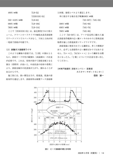 N/!級『LB―』『ZERODE―』『LB―』『LB―』『LB―』〜N/!級N/!級N/!級ここで『ZERODE―』は、最近開発された低ヒューム、クリーンロードタイプの極低水素系溶接棒でアークソフトでスパッタ少なく、下向と立向が同一電流で溶接が可能です。と同様、強度レベルより選定します。単に接合する場合及び軟鋼N/!級N/!級N/!級N/!級『SE―T』『MG―』『MG―』『MG―』『MG―』ここで『SE―T』は、アーク安定性に優れた適正溶接条件範囲の広い銅メッキのかわりに特殊表面処理を施した低電流用ソリッドワイヤです。()炭酸ガス溶接用ワイヤこのような鋼板の溶接では、『番』の割れとともに、溶接ビード中央の縦割れ(高温割れ)の注意が必要です。これは、母材が溶けて溶接金属となる割合(希釈率)が高いと、中高炭素の母材の希釈により、溶接金属中の炭素量が上がり、割れることがあるからです。施工的には、狭い開先はさけ、低電流、低速の溶接条件を選定します。溶接材料は被覆アーク溶接棒溶接現場に使用されている鋼材は、多くの種類があり、必ずしも溶接性のよい鋼材ばかりではありません。『S××C』、『SCM×××』という鋼材をお聞きになったら、『番』についての注意を思い出してください。(!神戸製鋼所溶接カンパニー営業部カスタマーサポートセンター)信田誠一86424溶接中心線からの距離(mm)20図ビード溶接部の硬さ分布例年月号(初夏号)|14500400300200400300200A'ABB'硬さ(ビッカース1kgf)A'溶接ビード(最高温度)1510℃1200℃1100℃900℃750℃B'68球状パーライト細粒中間粗粒中間細粒球状パーライトHT5220mm)(0.2%C,1.38%Mn,0.23%Si)170A,25V,150mm/min