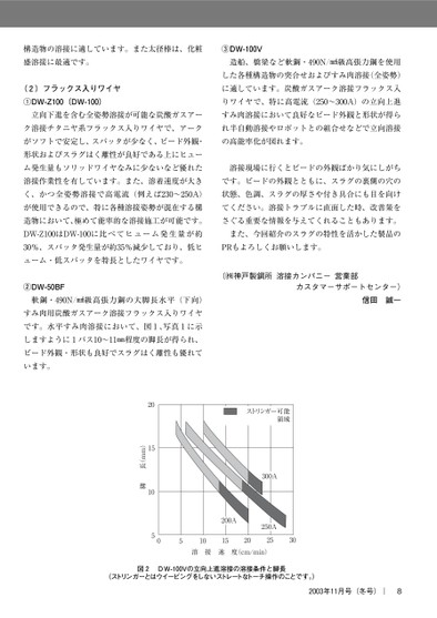 ③DW-V造船、橋梁など軟鋼・N/"級高張力鋼を使用した各種構造物の突合せおよびすみ肉溶接(全姿勢)に適しています。炭酸ガスアーク溶接フラックス入りワイヤで、特に高電流(〜A)の立向上進すみ肉溶接において良好なビード外観と形状が得られ半自動溶接やロボットとの組合せなどで立向溶接の高能率化が図れます。溶接現場に行くとビードの外観ばかり気にしがちです。ビードの外観とともに、スラグの裏側の穴の状態、色調、スラグの厚さや付き具合にも目を向けてください。溶接トラブルに直面した時、改善策をさぐる重要な情報を与えてくれることもあります。また、今回紹介のスラグの特性を活かした製品のPRもよろしくお願いします。(!神戸製鋼所溶接カンパニー営業部カスタマーサポートセンター)信田誠一ストリンガー可能領域300A200A250A151025溶接速度(cm/min)2030構造物の溶接に適しています。また太径棒は、化粧盛溶接に最適です。()フラックス入りワイヤ①DW-Z(DW-)立向下進を含む全姿勢溶接が可能な炭酸ガスアーク溶接チタニヤ系フラックス入りワイヤで、アークがソフトで安定し、スパッタが少なく、ビード外観・形状およびスラグはく離性が良好である上にヒューム発生量もソリッドワイヤなみに少ないなど優れた溶接作業性を有しています。また、溶着速度が大きく、かつ全姿勢溶接で高電流(例えば〜A)が使用できるので、特に各種溶接姿勢が混在する構造物において、極めて能率的な溶接施工が可能です。DW-ZはDW-に比べてヒューム発生量が約%、スパッタ発生量が約%減少しており、低ヒューム・低スパッタを特長としたワイヤです。②DW-BF軟鋼・N/"級高張力鋼の大脚長水平(下向)すみ肉用炭酸ガスアーク溶接フラックス入りワイヤです。水平すみ肉溶接において、図、写真に示しますようにパス〜!程度の脚長が得られ、ビード外観・形状も良好でスラグはく離性も優れています。201510脚長(mm)505図DW-Vの立向上進溶接の溶接条件と脚長(ストリンガーとはウイービングをしないストレートなトーチ操作のことです。)年月号(冬号)|8