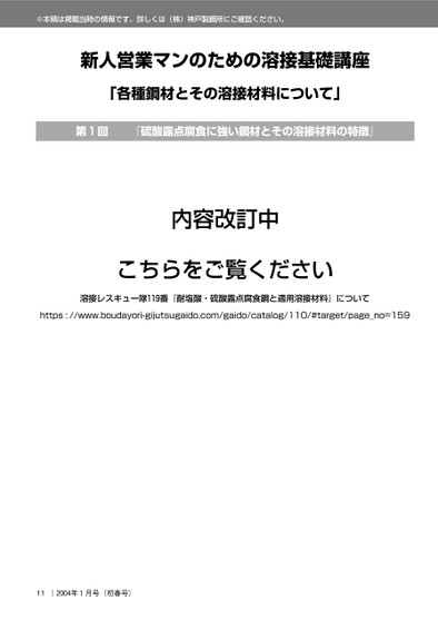 ※本稿は掲載当時の情報です。詳しくは(株)神戸製鋼所にご確認ください。新人営業マンのための溶接基礎講座「各種鋼材とその溶接材料について」第回『硫酸露点腐食に強い鋼材とその溶接材料の特徴』内容改訂中こちらをご覧ください溶接レスキュー隊番『耐塩酸・硫酸露点腐食鋼と適用溶接材料』についてhttps://www.boudayori-gijutsugaido.com/gaido/catalog/110/#target/page_no=15911|年月号(初春号)