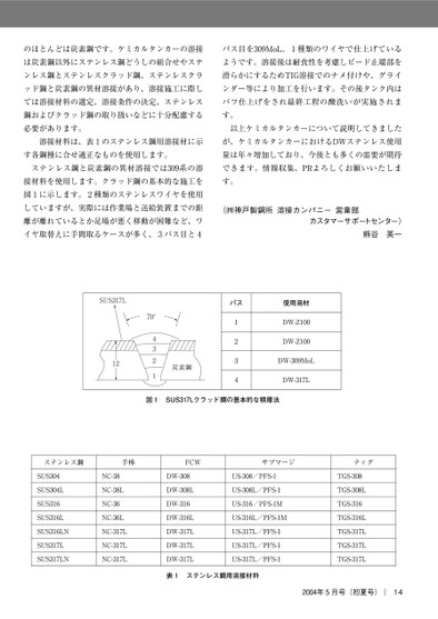 のほとんどは炭素鋼です。ケミカルタンカーの溶接は炭素鋼以外にステンレス鋼どうしの組合せやステンレス鋼とステンレスクラッド鋼、ステンレスクラッド鋼と炭素鋼の異材溶接があり、溶接施工に際しては溶接材料の選定、溶接条件の決定、ステンレス鋼およびクラッド鋼の取り扱いなどに十分配慮する必要があります。溶接材料は、表のステンレス鋼用溶接材に示す各鋼種に合せ適正なものを使用します。ステンレス鋼と炭素鋼の異材溶接では系の溶接材料を使用します。クラッド鋼の基本的な施工を図に示します。種類のステンレスワイヤを使用していますが、実際には作業場と送給装置までの距離が離れているとか足場が悪く移動が困難など、ワイヤ取替えに手間取るケースが多く、パス目とパス目をMoL、種類のワイヤで仕上げているようです。溶接後は耐食性を考慮しビード止端部を滑らかにするためTIG溶接でのナメ付けや、グラインダー等により加工を行います。その後タンク内はバフ仕上げをされ最終工程の酸洗いが実施されます。以上ケミカルタンカーについて説明してきましたが、ケミカルタンカーにおけるDWステンレス使用量は年々増加しており、今後とも多くの需要が期待できます。情報収集、PRよろしくお願いいたします。(!神戸製鋼所溶接カンパニー営業部カスタマーサポートセンター)熊谷英一年月号(初夏号)|14パス使用溶材DW-ZDW-ZDW-MoLDW-L炭素鋼70°2341SUS317L12図SUSLクラッド鋼の基本的な積層法ステンレス鋼手棒FCWサブマージティグSUSSUSLSUSSUSLSUSLNSUSLSUSLNNC-NC-LNC-NC-LNC-LNC-LNC-LDW-DW-LDW-DW-LDW-LDW-LDW-LUS-/PFS-US-L/PFS-US-/PFS-MUS-L/PFS-MUS-L/PFS-US-L/PFS-US-L/PFS-表ステンレス鋼用溶接材料TGS-TGS-LTGS-TGS-LTGS-LTGS-LTGS-L