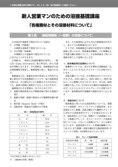 ※本稿は掲載当時の情報です。詳しくは(株)神戸製鋼所にご確認ください。新人営業マンのための溶接基礎講座「各種鋼材とその溶接材料について」第回『造船用鋼板(一般鋼)の溶接について』①②日本国内の造船所で建造されている船は、小型船(内航船)小規模な造船所で建造されている。中大型船(外航船)中規模以上の造船所で建造されている。に分けることができます。小型船は、一般的にJIS規格鋼材を使用し、一般にJG(JapanGovernment)船と呼ばれ、国土交通省の管轄となります。中大型船は、各船級協会の認定規格鋼材を使用し、船級規格に従い、建造されます。船級協会とは、船舶所有者の希望により所有する船に格付けする団体機関のことです。海上保険業者や荷主は、その格付けにより船舶そのものを見なくても、船体や貨物に保険をつけることができます。船級協会の主な業務は、以下のとおりです。①②③④船舶の構造検査および船級登録に関する規則の発行船級の登録、船級の検査および満載喫水線の指定船名録(Register造船材料、船舶品の試験および検査Book)の発行表各船級協会の略号国日名本イギリスアメリカノウルエーフランスドイツイタリア韓中台国国湾略号NK*LR*AB*NV*BV*GLRIKRCCSCR*が代表的な船級と言われています。11|年月号(秋号)また、主な海運国にはそれぞれの船級協会が存在し、表に主な船級協会に示します。ここでは、各船級協会の認定の必要な中大型船の商船に用いられる、船体構造用鋼材、主に軟鋼および高張力鋼の溶接について、日本海事協会(NK)の規格を例として説明いたします。.船体構造用圧延鋼材について軟鋼材については、切り欠き靭性の試験温度(ねばさ)によりA.B.D.E.のグレードに分類されています。高張力鋼については、その降伏点のレベルによりそれぞれ、N/!以上、N/!以上、N/!以上、の種類にわけられています。また同一強度の鋼材であっても、その切り欠き靭性の試験温度(ねばさ)によりA.D.E.F.のグレードに分類されています。船体構造用圧延鋼材の規格を表に示します。.溶接材料について船体構造に用いられる溶接材料についても、被覆アーク溶接棒、ガスシールドアーク溶接材料、など溶接法ごとに軟鋼、高張力鋼などの鋼種のグレードに対応する溶接材料のグレードが規定されています。溶接材料については、被覆アーク溶接棒について、種類のグレード、ガスシールドアーク溶接材料については、ないし種類のグレードに分類されています。溶接材量のグレード別適用鋼種について表に、また軟鋼・高張力鋼用半自動溶接材料(ガスシールド溶接)NK規格を表に示します。表グレード別適用鋼種溶接材料の種類軟鋼高張力鋼グレードグレードグレードグレードA級鋼ABD級鋼ABDE級鋼A級鋼AD級鋼ADE級鋼ADEF級鋼