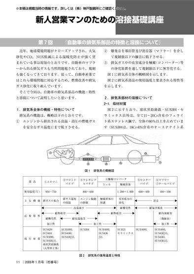 ※本稿は掲載当時の情報です。詳しくは(株)神戸製鋼所にご確認ください。新人営業マンのための溶接基礎講座第回『自動車の排気系部品の特徴と溶接について』近年、地球環境問題がクローズアップされ、大気浄化やCO,NOX低減による温暖化防止が強く望まれている事は周知のとおりです。自動車のマフラーから出る排気ガスも当然問題視されており、規制も強くなってきております。従って、自動車産業ではこれら環境問題に対応するため、燃費改善や排気ガス浄化に取り組んでいます。そこで今回は、自動車の排気系部品の機能・特性と溶接について説明したいと思います。.排気系全体の機能・特性について排気系の機能は、概略以下のとおりです。①エンジンから排出される高温・高圧の燃焼ガスを安全なガス温度にまで低下させる。②③爆発音を導出管及び消音器(マフラー)を介して規制値以下の騒音に低下させる。排気ガス中の有害成分を触媒(コンバーター)等の浄化装置を通して規制値以下に無害化する。図に排気系全体の概略図を示します。図に排気系部品の使用温度と要求される特性等を示します。.排気系部材の溶接について.母材材質―図に示すとおり、球状黒鉛鋳鉄・SUS・セラミックス以外は、全て〜Cr含有のフェライト系ステンレス鋼で、全体の%以上を占めています(SUSは、Cr-Ni含有のオーステナイト系図排気系の概略図部品①エキマニ②フロントパイプ③フレキシブルパイプ④触媒コンバータシェル触媒担体⑤センターパイプ⑥マフラー⑦テールパイプ使用温度(℃)〜〜主な機能排ガスの集合排ガス温度の保温エンジン振動の抑制触媒担体の保護,〜,有害成分の浄化耐酸化性〜〜消音耐塩害腐食耐内面腐食(凝縮水)加工性SUHLSUSJLSUSLSUSJL耐熱疲労耐熱疲労高温強さ耐高温塩害SUSSUHLSUSLSUSJL加工性SUHLSUSJLSUHセラミックスSUHL必要特性現行材質耐酸化性加工性SUSSUSSUHLSUHJL球状黒鉛鋳鉄(大型車主体)11|年月号(初春号)図排気系の使用温度と特性