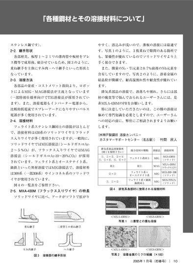 「各種鋼材とその溶接材料について」ステンレス鋼です)。.継手形状―各部材共、板厚〜ミリの薄肉管や板材をプレス機等で成形後、組合せているため、図のように、重ね継手を主体にすみ肉・ヘリ継手といった形状となっています。―.溶接方法各部品の量産・コストメリット指向より、ロボットによるMIG・MAG溶接法が主流となっています(一部特別仕様車向けでTIG溶接法が採用されています)。また、溶接電源もインバーター電源から、比較的低電流でスプレーアークになりやすいパルス電源が多く使用されています。―.溶接材料フェライト系ステンレス鋼同士の溶接がほとんどで、溶接材料は系のソリッドワイヤとフラックス入りワイヤが多く使用されていますが、一般的に、ソリッドワイヤではMIG溶接法(シールドガス⇒Ar-〜%O)が、フラックス入りワイヤではMAG溶接法(シールドガス⇒Ar-〜%CO)が採用されています。フェライト系とオーステナイト系、鋳鉄といった異材溶接ではMIG溶接法で、溶接材料は系(一部系)やインコネル系のソリッドワイヤが使用されています。図の一覧表をご参照下さい。―.MXA-M(フラックス入りワイヤ)の特長ソリッドワイヤに比べ、アークがソフトで拡がりやすく、溶込みが浅いので、薄板の溶接には最適です。写真のように、枚重ねで隙間のある箇所でも、架橋性が優れているのでソリッドワイヤより上手く接合できます。また、微量のN・Ti元素と.%前後のNb元素を含有していますので、写真のように、溶着金属の結晶粒が微細で、耐高温割れ性や耐食性が優れています。排気系部品の溶接で、溶落ちや割れ、さらには部材の腐食等で悩んでおられるユーザーさんには、是非MXA-MのPRをお願いします。特に注意していただきたいのは、この種の溶接は極めて専門知識を必要としますので、ユーザーさんへの対応の前に、弊社にご相談されますようお願いします。(!神戸製鋼所溶接カンパニーカスタマーサポートセンター(名古屋))竹間民人排気系部品溶接箇所(図を参照下さい)①,①×②,②×④④,⑤×⑥,⑥,⑥×⑦同上②×③①,①×②接合母材の種類溶接法溶接材料フェライト系同士MIG同上フェライト系×オーステナイト系フェライト系×鋳鉄鋳鉄同士MAGMIGMIGMGS-M(ソリッド)MXA-M(フラックス入り)MGS-・(ソリッド)MGS-NCb(ソリッド)図排気系各部材に使用される溶接材料重ね継手二重管との重ね継手<MXA-M><MGS-M>写真二重管との重ね溶接すみ肉継手へり継手図溶接部の継手形状<MXA-M><MGS-M>写真溶着金属のミクロ組織(×)年月号(初春号)|10