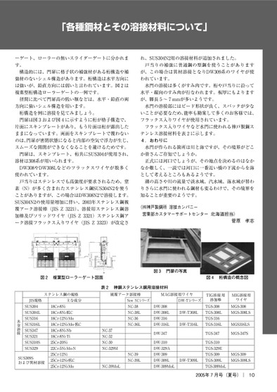 年月号(夏号)|10「各種鋼材とその溶接材料について」ーゲート、ローラーの無いスライダーゲートに分かれます。構造的には、門扉に格子状の補強材がある桁構造や補強材のないシェル構造があります。桁構造は水平方向には強いが、鉛直方向には弱いと言われています。図は複葉型桁構造ローラーゲートの一例です。径間に比べて門扉高の低い堰などは、水平・鉛直の両方向に強いシェル構造を用います。桁構造を例に溶接を見てみましょう。門扉は図および図に示すように桁が格子構造で、片面にスキンプレートがあり、もう片面は桁が露出したままになっています。両面をスキンプレートで覆わないのは、門扉が密閉状態になると内部の空気で浮力が生じ、スムーズな開閉ができなくなることを避けるためです。れ、SUSN用の溶接材料が追加されました。戸当りの補強に普通鋼の型鋼を使うことがありますが、この場合は異材溶接となりDW系のワイヤが使われています。水門の溶接は多くがすみ肉です。桁や戸当りに沿って水平・縦向のすみ肉が行なわれます。板厚にもよりますが、脚長〜mmが多いようです。水門の溶接部にはビード形状が良く、スパッタが少ないことが必要なため、能率も勘案して多くのお客様では、フラックス入りワイヤが使用されています。フラックス入りワイヤなど水門に使われる神戸製鋼ステンレス溶接材料を表に示します。.おわりに水門が作られる箇所は川と海ですが、その境界がどこ門扉は、スキンプレート、桁共にSUSが使用され、か皆さんご存知でしょうか。溶材は系が用いられます。DWやDWLなどのフラックスワイヤが数多く使われています。戸当りはステンレスでも高強度が要求されるため、窒素(N)が多く含まれたステンレス鋼SUSNを使うことがありますが、この場合はDWNで溶接します。SUSNの使用量増加に伴い、年ステンレス鋼被Z)、溶接用ステンレス鋼溶覆アーク溶接棒(JISZ)ステンレス鋼ア加棒及びソリッドワイヤ(JISーク溶接フラックス入りワイヤ(JISZ)が改定さ正式には河口でしょうが、その地点を決めるのはなかなか難しく、一説では河口に一番近い橋の下流からを海として考えるところもあるようです。潮の高さや川の流量で淡水域、汽水域、海水域が替わりさらに水門に使われる鋼材も変るわけで、その境界を知ることが重要のようです。(!神戸製鋼所溶接カンパニー営業部カスタマーサポートセンター北海道担当)菅原孝志図桁構造の概念図TIG溶接用溶加棒TGS-308TGS-308LTGS-316TGS-316LMIG溶接用ワイヤMGS-308MGS-308LSMGS316LSTGS-347MGS-347STGS-310TGS-329ETGS-309TGS-309LTGS-309MoLMGS-309MGS-309LS図複葉型ローラーゲート図面ステンレス鋼の規格被覆アーク溶接棒MAG溶接用ワイヤ表神鋼ステンレス鋼用溶接材料図門扉の写真NCシリーズNewNC-38NC-38LNC-36NC-36LNC-39NC-39LDW-308DW-308LDW-316DW-316LDW-347DW-310DW-329ADW-309DW-309LDW-309MoLDW-TシリーズDW-T308LDW-T316LDW-T309LNC-37NC-32NC-30NC-329MNC-39MoL主な成分18Cr-8Ni18Cr-8Ni-低C18Cr-12Ni-Mo18Cr-12Ni-Mo-低C18Cr-8Ni-Nb18Cr-8Ni-Ti25Cr-20Ni22Cr-5Ni-Mo-N25Cr-12Ni25Cr-12Ni-低C25Cr-12Ni-MoJIS規格SUS304SUS304LSUS316SUS316LSUS347SUS321SUS310SSUS329共金溶接SUS309Sおよび異材溶接