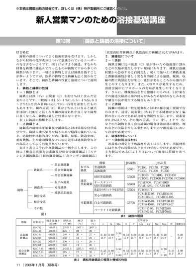 ※本稿は掲載当時の情報です。詳しくは(株)神戸製鋼所にご確認ください。新人営業マンのための溶接基礎講座第回『鋳鉄と鋳鋼の溶接について』はじめに鋳物の溶接についてよく技術相談を受けます。しかしながら材料の化学成分について意識されているユーザーの方は少ないようです。図に示すよう鋳造、すなわち材料を鋳型に鋳込んで作ったものが鋳物ですから多くの種類があります。一般には鋳物と言えば鋳鉄を指すことが多いようですが、鉄系の鋳物では鋳鋼も広く使われています。そこで、鋳鉄と鋳鋼の性質と溶接について説明します。.鋳鉄と鋳鋼の性質-鋳鉄とは鋳鉄とは鉄(Fe)に炭素(C)を約%以上含んだ合金のことです。一般的には.〜%C、.〜%Si、.〜%Mnを含み目的に応じてNi、Cr等を添加したものもあります。鋼の炭素(C)量が%以上になると融点が〜℃と低くなり鋼の湯流れ性が良くなり鋳型に良くなじみ、鋳物に適した性質になります。表に鋳鉄の種類を示します。-鋳鋼とは鋳鋼系の鋳物は圧延鋼板や鍛鋼品とほぼ同様な化学成分です。鋳鉄に比べ強さや粘さの点で格段に優れている上、溶接性が比較的良いため、製鉄、船舶、鉄道車両、重電機械、土木建設機械などに加え近年は建築鉄骨などの部品として広く利用されています。表と表にそれぞれ鋳鋼品の一例を示します。この他に「構造用高張力炭素鋼及び低合金鋼鋳鋼品」「ステンレス鋼鋳鋼品」「耐熱鋼鋳鋼品」「高マンガン鋼鋳鋼品」「高温高圧用鋳鋼品」低温高圧用鋳鋼品」などがあります。.溶接性について-鋳鉄鋳鉄は鋼に比べ炭素(C)量が多いため溶接部に割れなどの欠陥が発生しやすい傾向にあります。鋳鉄は溶融状態から急冷すると白銑化し、硬くて脆い上に鋳鉄素地と熱膨張係数が著しく異なり溶接による加熱、凝固、収縮の際に残留応力が生じ、延性が劣るところから割れが生じやすくなります。また、COガスが発生するため、溶接金属中にブロホールの欠陥が発生しやすくなります。さらに、機械部品などに使用中のものは、引け巣などの鋳造欠陥部に油の侵入があるため母材のなじみ不足や融合不良が発生する場合もあります。-鋳鋼鋳鋼の溶接は一般圧延鋼板とほぼ同様な施工要領で行われます。通常、炭素量.%以下で不純物が少なく偏析のないものであれば良好な溶接性を示します。炭素量が.%以上や、その他の元素、リン(P)、イオウ(S)などの不純物を多く含む鋳鋼の場合は溶接部の硬化、割れなどの欠陥を生じる事がありますので溶接施工において注意が必要です。.溶接材料について-鋳鉄用溶接材料溶接棒の選定と予熱温度を表に示します。溶接材料にはそれぞれ特徴がありますので使い分けが必要です。主力製品であるCIA-とについて簡単に特徴を述べます。鋳物鋳鋼系鋳鉄系銅合金系軽合金系その他図種類炭素鋼鋳鋼品低合金鋼鋳鋼品材料記号KSCKSCKSCKSCKSCKSCKSCAKSCAKSCA引き張強さ(N/!)以上以上以上以上以上以上以上以上以上11|年月号(初春号)炭素鋼鋳鋼低合金鋼鋳鋼高合金鋼鋳鋼ねずみ鋳鉄可段鋳鉄球状黒鉛鋳鉄ねずみ鋳鉄球状黒鉛鋳鉄種類普通鋳鉄高級鋳鉄球状黒鉛鋳鉄オーステンパ球状黒鉛鋳鉄低温用中肉フェライト球状黒鉛黒心可鍛鋳鉄JIS規格GGGG可鍛鋳鉄白心可鍛鋳鉄Gパーライト可鍛鋳鉄JIS記号FC,FC,FCFC,FC,FCFCD,FCD,FCDFCD,FCD,FCD,FCDFCAD,FCADFCAD,FCADFCDLTFCMB-,FCMB-FCMB-,FCMB-SFCMW-,FCMW-FCMW-,FCMW-FCMP-,FCMP-FCMP-,FCMP-降伏点(N/!)以上〃〃〃〃〃以上〃〃伸び(%)以上〃〃〃〃〃以上〃〃絞り(%)以上〃〃〃〃〃以上〃〃表1鋳鉄の種類化学成分CSiMnSPCuCrNiMoW不純物の合計.以下.以下.以下.以下.〜..以下.以下.以下.以下.以下.以下-.以下.〜..以下.以下.以下.以下.以下.〜..以下.以下表鋼船用鋳鋼品の種類と機械的性能