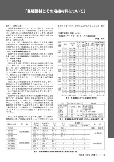 「各種鋼材とその溶接材料について」要がありますので、ご不明な点がありましたらご一報下さい。(!神戸製鋼所溶接カンパニー営業部カスタマーサポートセンター九州地区担当)銘柄予熱温度(%)母材とのなじみ母材との色調継手効率X線性能伊藤常年溶接金属の機械加工性熱影響部の機械加工性鋳鉄類の種◎○△△◎○△△◎○△△◎○△△◎○△△◎○△◎◎○△◎◎○△◎◎○△◎◎○△◎◎◎◎◎◎◎◎◎◎◎◎◎◎◎◎◎◎◎◎◎◎◎◎◎◎◎◎◎○◎◎◎○◎◎◎○◎◎◎△△◎◎△△◎◎△△◎◎△△◎◎△△◎◎◎◎◎◎◎◎◎◎◎◎◎◎◎◎◎◎◎◎◎◎○:やや優れている△:劣っている普通鋳鉄高級鋳鉄可鍛鋳鉄球状黒鉛鋳鉄合金鋳鉄CIA-CIA-CIA-CIA-CIA-CIA-CIA-CIA-CIA-CIA-CIA-CIA-CIA-CIA-CIA-CIA-CIA-CIA-CIA-CIA-〜〜〜〜〜〜〜〜〜〜〜〜〜〜〜〜〜〜〜〜(注)◎:優れている表各種鋳鉄に対する溶接棒の選び方記号SC、SCSCWSCSCWSCWSCW〜炭素当量(%)予熱(℃)溶接材料.未満不要〜〜....〜〜低水素系溶接棒(LB、LB等)半自動ワイヤ(MG、MXーZ等)低水素系溶接棒(LB、LB等)半自動ワイヤ(MG、MG等)表炭素鋼鋳鋼の炭素当量をもとにした溶接材料の一例CIA-(DFCNi系)溶接金属組成はニッケル(Ni)が主体です。母材から溶接金属への炭素(C)の拡散が起こらず融合部の炭素(C)の減少による白銑化現象を最小にします。融合部の硬化上昇が少ないため耐割れ性が良く溶接性が最も良好です。また機械加工も可能です。CIA-(DFCNiFe系)ニッケル(Ni)を約%含み、純ニッケル系より線膨張係数が小さく溶接熱収縮応力の発生が少ないため耐割れ性が良好です。普通鋳鉄はもとより、溶接金属の強度が高いので球状黒鉛鋳鉄の溶接に適しています。-炭素鋼鋳鋼用溶接材料鋳鋼の溶接材料は圧延鋼材や鍛鋼品と同じ溶材を使用します。表に炭素鋼鋳鋼品の溶接材料の一例を示します。.溶接施工要領-鋳鉄の場合溶接は鋳造欠陥や使用中の破損などの補修に限定されます。補修に際しては、開先加工は一般鋼材の場合より広く(〜°)し底部はなじみを良くするため丸く(R)加工して下さい。加工の際は熱を伴うアークエアーガウジングは避け機械加工やグラインダーなどで加工します。機械部品などの補修の場合は欠陥部に油などが浸透している場合があるのでバーナーなどにより℃程度で加熱除去します。溶接に際しては適度な予熱(表参照)を実施します。運棒方法は過大な熱影響部を作らないため、ストレート運棒で連続溶接は避ける。溶接ビード長さはmm以内とし、すぐさま溶接金属の剥離や割れを防ぐため熱間ピーニング(溶接部の歪と残留応力の軽減処置)を行います。-鋳鋼の場合鋳鋼の溶接施工要領は基本的に圧延鋼材や鍛鋼品と同様ですが、鋳鋼品は一般的に複雑な形状が多く、板厚の厚いのが特徴です。溶接に際しては鋼材の炭素当量や板厚によって予熱、パス間温度ならびに溶接後熱処理、溶接材料などを考慮する必要があります。鋼材の炭素当量と板厚を考慮した予熱温度の目安は神鋼溶接総合カタログ(赤カタ)ページに記載していますので参考にして下さい。以上、鋳鉄と鋳鋼について述べましたが、特に鋳鉄の補修溶接に際しては施工要領をしっかり理解して行う必年月号(初春号)|10適用電気、一般構造一般構造用溶接構造用衝撃値(J)試験温度号試験片--------(℃)以上〃〃〃〃〃〃〃〃絞り(%)以上以上〃〃-----降伏点(N/!)以上〃〃〃以上〃〃〃〃引張強さ(N/!)以上以上〃〃以上〃〃〃〃伸び(%)以上〃〃〃以上〃〃〃〃表炭素鋼鋳鋼と溶接用鋳鋼の種類と機械的性能の例種類の記号種類SCSCSCSCSCWSCWSCWSCWSCW炭素鋼鋳鋼品溶接用鋳鋼品
