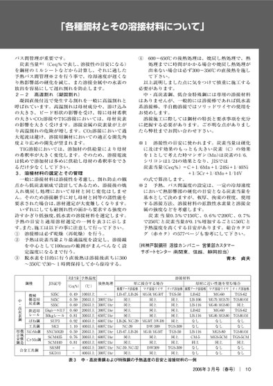 「各種鋼材とその溶接材料について」パス間管理が重要です。炭素当量※(Ceq%で表し、溶接性の目安になる)を鋼材のミルシートなどから計算し、それに適した予熱パス間管理※を行う事で、冷却速度が遅くなり熱影響部の硬化を減じ、また溶接金属中の水素の放出を容易にして遅れ割れを防止します。-高温割れ(凝固割れ)凝固直後付近で発生する割れを一般に高温割れと呼ばれています。高温割れは母材成分や、溶け込みの大きさ、ビード形状の影響を受け、特に母材希釈の大きいCO溶接やTIG溶接においては、母材炭素の影響を大きく受けます。溶接金属の炭素量が上がり高温割れの危険が増します。CO溶接において過大電流は避け、溶接用鋼材においての適正な開先角度より広めの開先が望まれます。TIG溶接においては、溶加材の供給量により母材の希釈率が大きく変化します。そのため、溶接電流は低めで溶加材は多めに供給し母材の希釈率をできるだけ少なくして下さい。.溶接材料の選定とその管理一般に溶接材料は溶接性を考慮し、割れ防止の観点から低炭素組成で設計してあるため、溶接後の焼入れ焼戻し処理において母材と同じ変化はしません。そのため溶接継手に対し母材と同等の諸性能を要求された場合は、溶材選定が大変難しくなります。いずれにしても耐割れ性の面から要求する強度の許すかぎり低強度、低水素の溶接材料を選定します。予熱の目安と適用溶材選定の一例を表に示します。また、施工は以下の事に注意して行って下さい。①②溶接棒は必ず乾燥(再乾燥)を行う。予熱は炭素当量より最適温度を設定し、溶接線を中心としてmmの範囲がまんべんなく設定温度になるまで行う。脱水素を目的に行う直後熱は溶接後直ちに〜℃で〜時間保持してから徐冷する。③④〜℃の後熱処理は、焼戻し熱処理で、熱処理までに時間がかかる場合や焼戻し熱処理が出来ない場合は必ず〜℃の直後熱を施して下さい。以上説明しました点に気をつけて慎重に施工する必要があります。中・高炭素鋼、低合金特殊鋼には専用の溶接材料はありませんが、一般的には溶接棒であれば低水素系溶接棒、半自動溶接ではソリッドワイヤの使用をお奨めします。溶接施工に際しては鋼材の特長と要求事項を充分に把握する必要があります。ご不明な点がありましたら弊社までお問い合わせ下さい。※溶接性の目安に使われます。炭素当量は硬化に及ぼす効果のもっとも大きい炭素(C)の効果をとして考えた時マンガン(Mn)は炭素の/,シリコンは/の効果となり、JISでは炭素当量(Ceq%)=C+/Mn+/Si+/Ni+/Cr+/Mo+/Vの式で算出します。※予熱、パス間温度の設定は、一定の冷却速度において熱影響部の硬化の目安となる炭素当量を基本として決めますが、板厚、拘束の程度、使用する溶接方法、溶接材料の拡散性水素量と溶接金属の強度などを考慮します。炭素当量.%で℃、.%で℃、.%で℃と炭素当量が.%増加するごとに℃と予熱温度を高くする目安があります。総合カタログ(赤カタ)のページも参考にして下さい。(!神戸製鋼所溶接カンパニー営業部カスタマーサポートセンター南関東、信越、静岡担当)青木貞夫年月号(春号)|10鋼種JIS記号炭素当量予熱温度(Ceq%)(℃)後熱処理溶接材料被覆アーク溶接棒LB-,LB-単に接合する場合マグ溶接ワイヤMG-,MG-Tティグ溶加棒TGS-母材に近い性能を望む場合被覆アーク溶接棒マグ溶接ワイヤMG-MG-,MGS-MG-,MGS-MG-MG-,MGS-ティグ溶加棒TGS-TGS-AM同上TGS-TGS-AMMGS-MGS-CMTGS-AMTGS-CMなしなし同上なしなしなしなし同上なしなしLB-LB-LB-LB-LB--LB-,NC-同上同上同上同上同上同上同上同上同上同上同上同上同上以上以上以上以上以上以上以上以上以上以上以上以上中・高炭素鋼および特殊鋼の予熱温度の目安と溶接材料の一例℃hr℃hr℃hr℃hr℃hr℃hr℃hr℃hr℃hr℃hr℃hrTGS-TGS-NC-,NC-MG-T,DW-LB-,LB-MG-,MG-TTGS-同上同上同上同上DW同上DW-同上同上同上NC-同上なしなしLB-CM-同上なしなし..........--表SCSCSCkgレール以下kgレールSUPSKSNCMSCMSCMSKS材SKD機械構造用炭素鋼鉄道用レールばね鋼工具鋼NiCrMo鋼Cr-Mo鋼中・高炭素鋼機械構造用合金鋼合金工具鋼