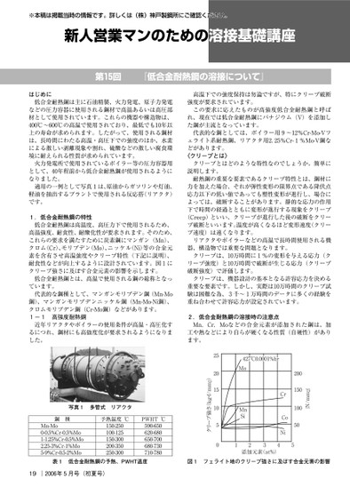 はじめに低合金耐熱鋼は主に石油精製、火力発電、原子力発電などの圧力容器に使用される鋼材で高温あるいは高圧部材として使用されています。これらの機器や構造物は、℃〜℃の高温で使用されており、最低でも年以上の寿命が求められます。したがって、使用される鋼材は、長時間にわたる高温・高圧下での強度のほか、水素による激しい剥離現象や割れ、硫酸などの激しい腐食環境に耐えられる性質が求められています。火力発電所で使用されているボイラー等の圧力容器用として、年程前から低合金耐熱鋼が使用されるようになりました。適用の一例として写真は、原油からガソリンや灯油、軽油を抽出するプラントで使用される反応搭(リアクタ)です。.低合金耐熱鋼の特性低合金耐熱鋼は高温度、高圧力下で使用されるため、高温強度、耐食性、耐酸化性が要求されます。そのため、これらの要求を満たすために炭素鋼にマンガン(Mn)、クロム(Cr)、モリブデン(Mo)、ニッケル(Ni)等の合金元素を含有させ高温強度やクリープ特性(下記に説明)、耐食性などが向上するように設計されています。図にクリープ強さに及ぼす合金元素の影響を示します。低合金耐熱鋼とは、高温で使用される鋼の総称となっています。代表的な鋼種として、マンガンモリブデン鋼(Mn-Mo鋼)、マンガンモリブデンニッケル鋼(Mn-Mo-Ni鋼)、クロムモリブデン鋼(Cr-Mo鋼)などがあります。-高強度耐熱鋼近年リアクタやボイラーの使用条件が高温・高圧化するにつれ、鋼材にも高強度化が要求されるようになりました。高温下での強度保持は勿論ですが、特にクリープ破断強度が要求されています。この要求に応えたものが高強度低合金耐熱鋼と呼ばれ、現在では低合金耐熱鋼にバナジウム(V)を添加した鋼が主流となっています。代表的な鋼としては、ボイラー用〜%Cr-Mo-Vフェライト系耐熱鋼、リアクタ用.%Cr-%Mo-V鋼などがあります。クリープとはどのような特性なのでしょうか。簡単に《クリープとは》説明します。耐熱鋼の重要な要素であるクリープ特性とは、鋼材に力を加えた場合、それが弾性変形の限界点である降伏点応力以下の低い値であっても塑性変形が進行し、場合によっては、破断することがあります。静的な応力の作用下で時間の経過とともに変形が進行する現象をクリープ(Creep)といい、クリープが進行した後の破断をクリープ破断といいます。温度が高くなるほど変形速度(クリープ速度)は速くなります。リアクタやボイラーなどの高温で長時間使用される機器、構造物では重要な問題となります。クリープは、万時間に%の変形を与える応力(クリープ強度)と万時間で破断が生じる応力(クリープ破断強度)で評価します。クリープは、機器設計の基本となる許容応力を決める重要な要素です。しかし、実際は万時間のクリープ試験は困難な為、千〜万時間のデータに多くの経験を重ね合わせて許容応力が設定されています。.低合金耐熱鋼の溶接時の注意点Mn,Cr,Moなどの合金元素が添加された鋼は、加工や熱などにより自らが硬くなる性質(自硬性)があります。{N/mm2}200150100505CrCoNi427℃0.0001%hrMoMnSi24添加元素(at%)312520151050クリープ強さ(kg・/mm2)写真多管式リアクタ種鋼Mn-Mo0-0.5%Cr-0.5%Mo1-1.25%Cr-0.5%Mo2.25-3%Cr-1%Mo5-9%Cr-0.5-2%Mo予熱温度℃150-250100-125150-300200-350250-300PWHT℃590-650620-680650-700680-730710-780表低合金耐熱鋼の予熱、PWHT温度図フェライト地のクリープ強さに及ぼす合金元素の影響19|年月号(初夏号)※本稿は掲載当時の情報です。詳しくは(株)神戸製鋼所にご確認ください。新人営業マンのための溶接基礎講座第回『低合金耐熱鋼の溶接について』
