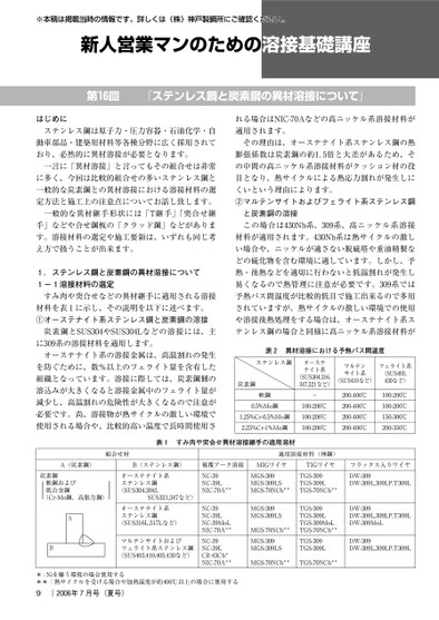 ※本稿は掲載当時の情報です。詳しくは(株)神戸製鋼所にご確認ください。新人営業マンのための溶接基礎講座第回『ステンレス鋼と炭素鋼の異材溶接について』はじめにステンレス鋼は原子力・圧力容器・石油化学・自動車部品・建築用材料等各種分野に広く採用されており、必然的に異材溶接が必要となります。一言に「異材溶接」と言ってもその組合せは非常に多く、今回は比較的組合せの多いステンレス鋼と一般的な炭素鋼との異材溶接における溶接材料の選定方法と施工上の注意点についてお話し致します。一般的な異材継手形状には「T継手」「突合せ継手」などや合せ鋼板の「クラッド鋼」などがあります。溶接材料の選定や施工要領は、いずれも同じ考え方で扱うことが出来ます。.ステンレス鋼と炭素鋼の異材溶接について-溶接材料の選定すみ肉や突合せなどの異材継手に適用される溶接材料を表に示し、その説明を以下に述べます。①オーステナイト系ステンレス鋼と炭素鋼の溶接炭素鋼とSUSやSUSLなどの溶接には、主に系の溶接材料を適用します。オーステナイト系の溶接金属は、高温割れの発生を防ぐために、数%以上のフェライト量を含有した組織となっています。溶接に際しては、炭素鋼側の溶込みが大きくなると溶接金属中のフェライト量が減少し、高温割れの危険性が大きくなるので注意が必要です。尚、溶接物が熱サイクルの激しい環境で使用される場合や、比較的高い温度で長時間使用される場合はNIC-Aなどの高ニッケル系溶接材料が適用されます。その理由は、オーステナイト系ステンレス鋼の熱膨張係数は炭素鋼の約.倍と大差があるため、その中間の高ニッケル系溶接材料がクッション材の役目となり、熱サイクルによる熱応力割れが発生しにくいという理由によります。②マルテンサイトおよびフェライト系ステンレス鋼と炭素鋼の溶接この場合はNb系、系、高ニッケル系溶接材料が適用されます。Nb系は熱サイクルの激しい場合や、ニッケルが適さない脱硫塔や重油精製などの硫化物を含む環境に適しています。しかし、予熱・後熱などを適切に行わないと低温割れが発生し易くなるので熱管理に注意が必要です。系では予熱パス間温度が比較的低目で施工出来るので多用されていますが、熱サイクルの激しい環境での使用や溶接後熱処理をする場合は、オーステナイト系ステンレス鋼の場合と同様に高ニッケル系溶接材料が表異材溶接における予熱パス間温度ステンレス鋼炭素鋼軟鋼0.5%Mo鋼1.25%Cr-0.5%Mo鋼2.25%Cr-1%Mo鋼オーステナイト系(SUS304,316,347,321など)-100-200℃100-200℃100-200℃マルテンサイト系(SUS410など)フェライト系(SUS405,430など)200-400℃200-400℃200-400℃200-400℃100-200℃100-200℃150-300℃200-350℃表すみ肉や突合せ異材溶接継手の適用溶材適用溶接材料(神鋼)被覆アーク溶接NC-39NC-39LNIC-70A**MIGワイヤMGS-309MGS-309LSMGS-70NCb**TIGワイヤTGS-309TGS-309LTGS-70NCb**フラックス入りワイヤDW-309DW-309L,309LP,T309LNC-39NC-39LNC-39MoLNIC-70A**NC-39NC-39LCR-43Cb*NIC-70A**MGS-309MGS-309LSMGS-70NCb**MGS-309MGS-309LSTGS-309TGS-309LTGS-309MoLTGS-70NCb**TGS-309TGS-309LMGS-70NCb**TGS-70NCb**DW-309DW-309L,309LP,T309LDW-309MoLDW-309DW-309L,309LP,T309Lオーステナイト系ステンレス鋼(SUS304,304LSUS321,347など)オーステナイト系ステンレス鋼(SUS316L,317Lなど)マルテンサイトおよびフェライト系ステンレス鋼(SUS403,410,405,430など)"##%組合せ材A(炭素鋼)B(ステンレス鋼)(Cr-Mo鋼、高張力鋼)AB炭素鋼軟鋼および低合金鋼!##$*:Niを嫌う環境の場合使用する**:熱サイクルを受ける場合や加熱温度が約400℃以上の場合に使用する9|年月号(夏号)