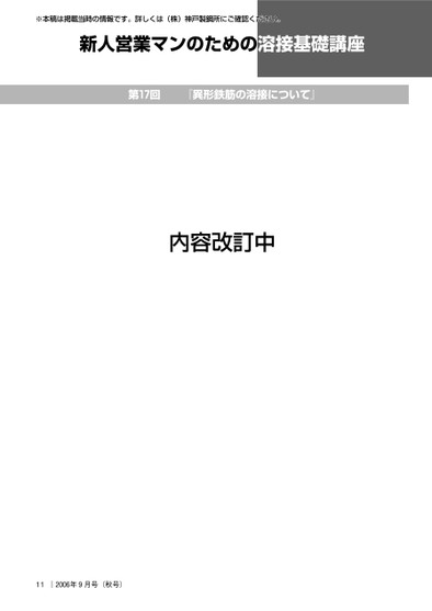 ※本稿は掲載当時の情報です。詳しくは(株)神戸製鋼所にご確認ください。新人営業マンのための溶接基礎講座第回『異形鉄筋の溶接について』内容改訂中11|年月号(秋号)