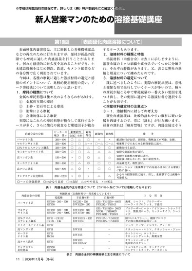 ※本稿は掲載当時の情報です。詳しくは(株)神戸製鋼所にご確認ください。新人営業マンのための溶接基礎講座第回『表面硬化肉盛溶接について』表面硬化肉盛溶接は、主に摩耗した各種機械部品などの再生のために行われますが、部材が新品の段階でも摩耗に適した肉盛溶接を行うことがあります。何れも経済的に耐久度を高めることができ、土木建設機械をはじめ製鉄、鉄道、セメント鉱業などの各分野で広く利用されています。今回は、各種の摩耗に適した溶接材料の選定と溶接のポイントについて、比較的使用頻度の高い、アーク溶接法について説明したいと思います。.摩耗の種類について金属相互間の摩耗土砂・岩石等による摩耗衝撃による摩耗高速流体による摩耗金属の摩耗形態は種々次のようなものがあります。①②③④実際にはこれらの摩耗形態が複合して進行するケースが多く、さらに酸化や腐食など環境因子が複合するケースもあります。.溶接材料の種類と特徴溶接材料(肉盛合金)は表に示しますように、溶接金属のミクロ組織や成分系でいくつかに分類され、それぞれ特徴があります。又、表は弊社の銘柄と用途について纏めたものです。.溶接材料の選定について既に述べましたように、実際の摩耗状況は、意外と複雑な形で進行していくケースが多いので、種々の摩耗が起こる中で摩耗減量の一番大きい要因を見つけ出し、その要因に適合する溶接材料を選択することが大切です。<溶接材料選定時の注意点>-.溶接割れに対しての考え方硬化肉盛溶接は、比較的割れやすい鋼材に硬い金属を肉盛するので、常に『割れ』が付き纏います。母材の割れは『絶対禁物』ですが、肉盛金属はそう備考耐割れ性が良好。溶接後、機械加工が可能。安価。軽衝撃下でのあらゆる研削摩耗に適す。耐酸化性も良好。強靭で耐割れ性が良好。強靭で重衝撃の摩耗に適す。溶接後は軟らかいが、加工硬化性大。高温硬度大。靭性良好。エロージョン(低衝撃下での高速小流体による摩耗)に特に強い。かなりの研削摩耗に適す。但し、重衝撃下では剥離の可能性大。耐衝撃性○耐食性耐熱性××△〜×○〜△○〜△○△△○○△○△△○○△△△◎◎××耐摩耗性金属土砂△○△○○△◎◎○○○○×○△×肉盛合金の分類パーライト系マルテンサイト系%クロムステンレス鋼系セミオーステナイト系ビッカース硬さHv〜〜〜〜高マンガン系オーステナイト系高クロム鉄系タングステン炭化物系〜〜〜〜◎〜×の評価基準◎⇒かなり良好○⇒良好△⇒やや劣る×⇒劣る表肉盛合金別の主な特性について(コバルト系については省略しております)主な用途歯車、シャフト、ブルドーザーローラ・スプロケット、下盛用ブルドーザーローラ・アイドラー・トラックリンク、製鉄用ローラ、カッターナイフ、ケーシングHF⇒バルブシート、攪拌プロペラその他⇒製鉄用各種ロールリッパーチップ、インペラ、ブレーカークラッシャー・ハンマ、クラッシャー・ジョーホットシャー、ホットソークロッシングレール、熱間金型クラッシャーロータ焼却炉のスクリューショベルティーズ、カッタナイフコンクリートカッタ、アースドリル自動材料G/USH〜NPFB/USBG/USH・NMF/USHNPFBH/USBPFHM/USHPFBS/USB-----表肉盛合金別の神鋼銘柄と主な用途について神鋼銘柄(自動材料で一部省略しています)肉盛合金の分類パーライト系マルテンサイト系電弧棒HF・・HF半自動材料MG・DWH・HF・・HF・・KDWH・DWH・%クロムステンレス鋼系セミオーステナイト系高マンガン系オーステナイト系HF・CRCR・HFHFHFMC高クロム鉄系タングステン炭化物系HFHFHF11|年月号(冬号)DWHS・DWH-DWHDWHDWHDWHMV-