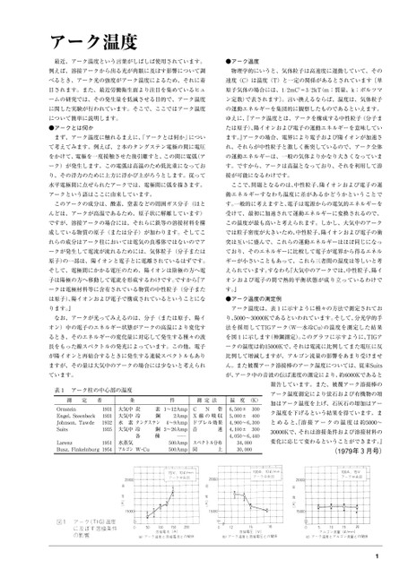 アーク温度最近、アーク温度という言葉がしばしば使用されています。●アーク温度例えば、溶接アークから出る光が肉眼に及ぼす影響について調物理学的にいうと、気体粒子は高速度に運動していて、そのべるとき、アーク光の強度がアーク温度によるため、それに着速度(C)は温度(T)と一定の関係があるとされています〔単目されます。また、最近労働衛生面より注目を集めているヒュ原子気体の場合には、1/2mC2=3/2kT(m:質量、k:ボルツマームの研究では、その発生量を低減させる目的で、アーク温度ン定数)で表されます〕。言い換えるならば、温度は、気体粒子に関した実験が行われています。そこで、ここではアーク温度の運動エネルギーを集団的に観察したものであるといえます。について簡単に説明します。●アークとは何かゆえに、『アーク温度とは、アークを構成する中性粒子(分子または原子)、陽イオンおよび電子の運動エネルギーを意味していまず、アーク温度に触れるまえに、「アークとは何か」についます。』アークの場合、電界により電子および陽イオンが加速さて考えてみます。例えば、2本のタングステン電極の間に電圧れ、それらが中性粒子と激しく衝突しているので、アーク全体をかけて、電極を一度接触させた後引離すと、この間に電弧(アの運動エネルギーは、一般の気体よりかなり大きくなっていまーク)が発生します。この電弧は高温のため低比重になっておす。ですから、アークは高温となっており、それを利用して溶り、その浮力のために上方に浮かび上がろうとします。従って接が可能になるわけです。水平電極間に点ぜられたアークでは、電極間に弧を描きます。ここで、問題となるのは、中性粒子、陽イオンおよび電子の運アークという語はここに由来しています。動エネルギーすなわち温度に差があるかどうかということでこのアークの成分は、酸素、窒素などの周囲ガス分子(ほとす。一般的に考えますと、電子は電源からの電気的エネルギーをんどは、アークが高温であるため、原子状に解離しています)受けて、最初に加速されて運動エネルギーに変換されるので、ですが、溶接アークの場合には、それらに鉄等の溶接材料を構この温度が最も高いと考えられます。しかし、大気中のアーク成している物質の原子(または分子)が加わります。そしてこでは粒子密度が大きいため、中性粒子、陽イオンおよび電子の衝れらの成分はアーク柱においては電気の良導体ではないのでア突は互いに盛んで、これらの運動エネルギーはほぼ同じになっークが発生して電流が流れるためには、気体粒子(分子またはており、そのエネルギーに比較して電子が電界から得るエネル原子)の一部は、陽イオンと電子とに電離されているはずです。ギーが小さいこともあって、これら三者間の温度は等しいと考そして、電極間にかかる電圧のため、陽イオンは陰極の方へ電えられています。すなわち『大気中のアークでは、中性粒子、陽イ子は陽極の方へ移動して電流を形成するわけです。ですから『アオンおよび電子の間で熱的平衡状態が成り立っているわけでークは電極材料等に含有されている物質の中性粒子(分子またす。』は原子)、陽イオンおよび電子で構成されているということにな●アーク温度の測定例ります。』アーク温度は、表1に示すように種々の方法で測定されておなお、アークが光ってみえるのは、分子(または原子、陽イり、5000〜30000Kであるといわれています。そして、分光学的手オン)中の電子のエネルギー状態がアークの高温により変化す法を採用してTIGアーク(W―水冷Cu)の温度を測定した結果るとき、そのエネルギーの変化量に対応して発生する種々の波を図1に示します(神鋼測定)。このグラフに示すように、TIGア長をもった線スペクトルの発光によっています。この他、電子ークの温度は約15000Kで、それは電流に比例してまた電圧に反が陽イオンと再結合するときに発生する連続スペクトルもあり比例して増減しますが、アルゴン流量の影響をあまり受けませますが、その量は大気中のアークの場合には少ないと考えられん。また被覆アーク溶接棒のアーク温度については、従来Suitsています。が、アーク中の音波の伝ぱ速度の測定により、約6000Kであると表1アーク柱の中心部の温度測定者条件測定法温度()K.OrnsteinEngelJohnsonSuitsSteenbeckTawde.LarenzBusz.Finkelnburg1931193119321935大気中炭大気中冷水大気中冷各素銅タングステン銅種素19511954水蒸気アルゴンWCu-13〜122〜9264〜500500AmpAmpAmpAmp――AmpAmpNのCX線ドプレル音帯吸収効果速6,5005,0004,9004,1004,050±±〜±〜3004006,3003006,440スペクトル分布同上34,00030,000報告しています。また、被覆アーク溶接棒のアーク温度測定により蛍石および有機物の増加はアーク温度を上げ、石灰石の増加はアーク温度を下げるという結果を得ています。まとめると、溶接アークの温度は約5000〜30000Kで、それは溶接条件および溶接材料の変化に応じて変わるということができます