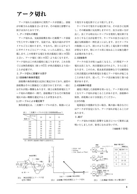 アーク切れアーク切れとは溶接中に突然アークが消弧し、溶接り発生する電圧降下により低下します。が中断される現象を言いますが、その原因と影響するケーブル中で発生する電圧降下は、その長さに比例因子は次のとおりです。1.アーク切れの原因し、その断面積に反比例しますので、長さは短い方が良く、長くする時は太いケーブルを使用し電圧降下をアーク切れは、交流溶接機を用いた被覆アーク溶接小さくする工夫が必要です。ケーブルの長さに応じたで生じやすい現象です。交流では、電気の流れが半サ適正な断面積の一例を表1に示します。またケーブルイクルごとに変わります。すなわち、図1に示すようの取扱いにより、図3のように著しく電圧降下の程度に半サイクルごとにアークは、いったん消失し、再点が異なります。特にコイル状に束ねることは極力避け弧します。この時要する電圧を再点弧電圧(図1のOB)る必要があります。と言い、アーク電圧(図1のOC)より高くなります。2.3溶接条件アーク切れはこの再点弧時に起こりますが、これを防アークの長さが約1㎜長くなると、2V程度アークぐには無負荷電圧(図1のOA)が再点弧電圧より高い電圧は高くなり、再点弧電圧はそれより、さらに高くことが必要です。2.アーク切れに影響する因子2.1溶接機の無負荷電圧なります。このため、低水素系溶接棒などでは瞬間的に再点弧電圧が無負荷電圧を超えアーク切れが起こることがあります。従って、アーク長は極力短く保つ必溶接機の無負荷電圧はJISに規定されており、通常の要があります。溶接機はその上限値近くに設計されてますが、一部に2.4溶接棒の吸湿はそれが低い機種もあります。図2は無負荷電圧とア過度に吸湿した溶接棒を用いると、アーク電圧が高ーク切れの関係の一例で、溶接機はできるだけ無負荷くなりアーク切れが起こることがあります。溶接棒の電圧の高い機種を選定することが望まれます。保管、再乾燥には十分留意してください。2.2ケーブルによる電圧降下2.5その他無負荷電圧は、二次側ケーブルの長さ、取扱いによ電源電圧の変動が大きい場合、風の強い場合などにはアークが不安定になり、アーク切れが起こることが表1二次側ケーブルの寸法(公称断面積mm2)長()さm電流()A100150200250300350400450253838383850505060503850608010010012512575386080100125125(注)使用率と電流値を考慮する必要がある。あります。3.結びアーク切れの原因と影響する因子について簡単に説明いたしましたが、参考になれば幸いです。(1989年7月号)3