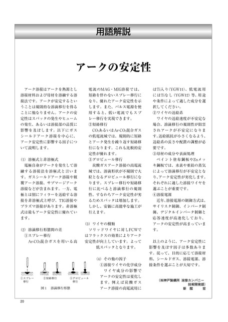 用語解説アークの安定性アーク溶接はアークを熱源とし電流のMAG・MIG溶接では、はTi入り(YGW11)、低電流用溶接材料および母材を溶融する溶短絡を伴わないスプレー移行ににはTiなし(YGW12)等、用途接法です。アークが安定するといなり、優れたアーク安定性を示や条件によって適した成分を選うことは規則的な溶滴移行を得るします。また、パルス電源を使ことに他なりません。アークの安用すると、低い電流でもスプ択してください。②ワイヤの送給系定性はスパッタの発生やヒュームレー移行を実現できます。の発生、あるいは溶接部の品質に②短絡移行ワイヤの送給速度が不安定な場合、溶滴移行の規則性が阻害影響を及ぼします。以下にガスCO2あるいはAr-CO2混合ガスされアークが不安定になりまシールドアーク溶接を中心に、の低電流域では、規則的に短絡す。送給抵抗が小さくなるよう、アーク安定性に影響する因子につとアーク発生を繰り返す短絡移送給系の長さや配置の調整が必いて説明します。行になります。これも比較的安要です。(1)溶極式と非溶極式定性が優れます。③グロビュール移行③母材の成分や表面処理ペイント塗布鋼板やZnメッ電極自身がアークを発生して溶炭酸ガスアーク溶接の高電流キ鋼板では、水素や亜鉛の蒸気融する溶接法を溶極式と言いま域では、溶滴形状が不規則で大によって溶滴移行が不安定となす。ガスシールドアーク溶接や被粒となるグロビュール移行になり、アーク安定性が劣化します。覆アーク溶接、サブマージアークります。スプレー移行や短絡移それぞれに適した溶接ワイヤを溶接などが含まれます。一方、電行に比べると溶滴移行の規則選ぶことが重要です。極とは別にフィラーを送給する溶性、すなわちアーク安定性が劣④溶接電源接を非溶極式と呼び、TIG溶接やるためスパッタは増加します。近年、溶接電源の制御方式は、プラズマ溶接があります。非溶極しかし、安価に高能率な施工がサイリスタ制御、インバータ制式は最もアーク安定性に優れてい行えます。ます。(3)ワイヤの種類御、デジタルインバータ制御と応答速度が高速化しており、アークの安定性が高まっていま(2)溶滴移行形態間の差ソリッドワイヤに対しFCWです。①スプレー移行はフラックスの効果によりアークAr-CO2混合ガスを用いる高安定性が向上しています。よって以上のように、アーク安定性に低スパッタとなります。影響を及ぼす因子は多数ありま(4)その他の因子す。従って、目的に応じて溶接材料、シールドガス、溶接電源、溶①溶接ワイヤの化学成分接条件を選ぶことが大切です。①スプレー移行②短絡移行③グロビュール移行図1溶滴移行形態ワイヤ成分の影響でアークの安定性は変化します。例えば炭酸ガスアーク溶接の高電流用に(㈱神戸製鋼所溶接カンパニー技術開発部)新舘宏20