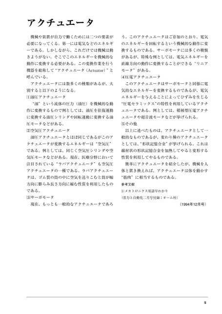 アクチュエータ機械や装置が自力で働くためには二つの要素がう。このアクチュエータはご存知のとおり、電気必要になってくる。第一には電気などのエネルギのエネルギーを回転するという機械的な動作に変ーである。しかしながら、これだけでは機械は動換するものである。サーボモータには多くの種類きようがない。そこでこのエネルギーを機械的ながあるが、特殊な例としては、電気エネルギーを動作に変換する必要がある。この変換作業を行う直線方向の動作に変換することができる“リニア機器を総称して“アクチュエータ(Actuator)”と呼んでいる。モータ”がある。圧電アクチュエータアクチュエータには数多くの種類があるが、大このアクチュエータはサーボモータと同様に電別すると以下のようになる。油圧アクチュエータ気的なエネルギーを変換するものであるが、電気エネルギーを与えることによってひずみを生じる“油”という流体の圧力(油圧)を機械的な動“圧電セラミックス”の特性を利用しているアクチ作に変換するもので例としては、油圧を往復運動ュエータである。例としては、積層型圧電アクチに変換する油圧シリンダや回転運動に変換する油圧モータなどがある。空気圧アクチュエータュエータや超音波モータなどが挙げられる。その他以上に述べたものは、アクチュエータとして一油圧アクチュエータとほぼ同じであるがこのア般的なものであるが、変わり種のアクチュエータクチュエータが変換するエネルギーは“空気圧”としては、“形状記憶合金”が挙げられる。これはである。例としては、同じく空気圧シリンダや空線材状の形状記憶合金を加熱してやると変形する気圧モータなどがある。現在、医療分野において性質を利用してやるものである。注目されている“ラバアクチュエータ”も空気圧簡単にアクチュエータを紹介したが、機械を人アクチュエータの一種である。ラバアクチュエー体と置き換えれば、アクチュエータは体を動かすタは、ゴム質の筒の中に空気を送りこむと筒が幅“筋肉”に相当するものである。方向に膨らみ長さ方向に縮む性質を利用したもの参考文献である。サーボモータ1)メカトロニクス用語早わかり(省力と自動化二月号付録;オーム社)現在、もっとも一般的なアクチュエータであろ(1994年12月号)5