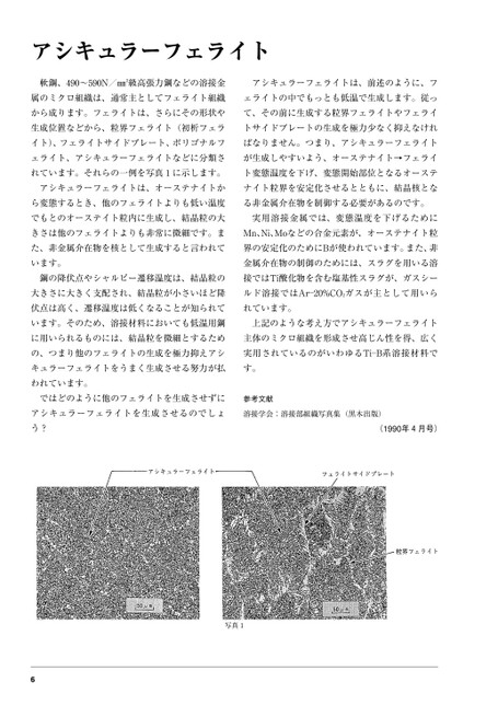 アシキュラーフェライト軟鋼、490〜590N/㎜2級高張力鋼などの溶接金アシキュラーフェライトは、前述のように、フ属のミクロ組織は、通常主としてフェライト組織ェライトの中でもっとも低温で生成します。従っから成ります。フェライトは、さらにその形状やて、その前に生成する粒界フェライトやフェライ生成位置などから、粒界フェライト(初析フェラトサイドプレートの生成を極力少なく抑えなけれイト)、フェライトサイドプレート、ポリゴナルフばなりません。つまり、アシキュラーフェライトェライト、アシキュラーフェライトなどに分類さが生成しやすいよう、オーステナイト→フェライれています。それらの一例を写真1に示します。ト変態温度を下げ、変態開始部位となるオーステアシキュラーフェライトは、オーステナイトかナイト粒界を安定化させるとともに、結晶核となら変態するとき、他のフェライトよりも低い温度る非金属介在物を制御する必要があるのです。でもとのオーステイト粒内に生成し、結晶粒の大実用溶接金属では、変態温度を下げるためにきさは他のフェライトよりも非常に微細です。まMn、Ni、Moなどの合金元素が、オーステナイト粒た、非金属介在物を核として生成すると言われて界の安定化のためにBが使われています。また、非います。金属介在物の制御のためには、スラグを用いる溶鋼の降伏点やシャルピー遷移温度は、結晶粒の接ではTi酸化物を含む塩基性スラグが、ガスシー大きさに大きく支配され、結晶粒が小さいほど降ルド溶接ではAr―20%CO2ガスが主として用いら伏点は高く、遷移温度は低くなることが知られてれています。います。そのため、溶接材料においても低温用鋼上記のような考え方でアシキュラーフェライトに用いられるものには、結晶粒を微細とするため主体のミクロ組織を形成させ高じん性を得、広くの、つまり他のフェライトの生成を極力抑えアシ実用されているのがいわゆるTi―B系溶接材料でキュラーフェライトをうまく生成させる努力が払す。われています。ではどのように他のフェライトを生成させずに参考文献アシキュラーフェライトを生成させるのでしょ溶接学会:溶接部組織写真集(黒木出版)う?(1990年4月号)写真16