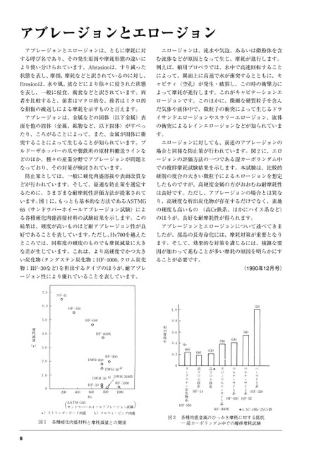 アブレージョンとエロージョンアブレージョンとエロージョンは、ともに摩耗に対エロージョンは、流水や気泡、あるいは微粉体を含する呼び名であり、その発生原因や摩耗形態の違いにむ流体などが原因となって生じ、摩耗が進行します。より使い分けられています。Abrasionは、すり減った例えば、舶用プロペラでは、水中で高速回転すること状態を表し、摩損、摩耗などと訳されているのに対し、によって、翼面上に高速で水が衝突するとともに、キErosionは、水や風、波などにより徐々に侵された状態ャビティ(空孔)が発生・破裂し、この時の衝撃力にを表し、一般に侵食、腐食などと訳されています。両よって摩耗が進行します。これがキャビテーションエ者を比較すると、前者はマクロ的な、後者はミクロ的ロージョンです。このほかに、微細な硬質粒子を含んな損傷の繰返しによる摩耗を示すものと言えます。だ気体や液体中で、微粒子の衝突によって生じるドラアブレージョンは、金属などの固体(以下金属)表イサンドエロージョンやスラリーエロージョン、流体面を他の固体(金属、鉱物など、以下固体)がすべっの衝突によるレインエロージョンなどが知られていまたり、ころがることによって、また、金属が固体に衝す。突することによって生じることが知られています。ブエロージョンに対しても、前述のアブレージョンのルドーザホッパーの爪や製鉄所の原材料搬送ラインな場合と同様な防止策が行われています。図2に、エロどのほか、種々の産業分野でアブレージョンが問題とージョンの評価方法の一つである湿カーボランダム中なっており、その対策が検討されています。での撹拌摩耗試験結果を示します。本試験は、比較的防止策としては、一般に硬化肉盛溶接や表面改質な研削の度合の大きい微粒子によるエロージョンを想定どが行われています。そして、最適な防止策を選定すしたものですが、高硬度金属の方がおおむね耐摩耗性るために、さまざまな耐摩耗性評価方法が提案されては良好です。ただし、アブレージョンの場合とは異ないます。図1に、もっとも基本的な方法であるASTMGり、高硬度な析出炭化物が存在するだけでなく、素地65(サンドラバーホイールアブレージョン試験)によの硬度も高いもの(高Cr鉄系、ほかにハイス系など)る各種硬化肉盛溶接材料の試験結果を示します。こののほうが、良好な耐摩耗性が得られます。結果は、硬度が高いものほど耐アブレージョン性が良アブレージョンとエロージョンについて述べてきま好であることを表しています。ただし、Hv700を越えたしたが、部品の長寿命化には、摩耗対策が重要となりところでは、同程度の硬度のものでも摩耗減量に大きます。そして、効果的な対策を講じるには、複雑な要な差が生じています。これは、より高硬度でかつ大き因が加わって進むことが多い摩耗の原因を明らかにすい炭化物(タングステン炭化物;HF―1000,クロム炭化ることが必要です。物;HF―30など)を析出するタイプのほうが、耐アブレージョン性により優れていることを表しています。(1990年12月号)8