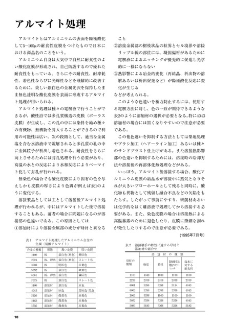 アルマイト処理アルマイトとはアルミニウムの表面を陽極酸化ことして5―100µの耐食性皮膜をつけたもので日本に②溶接金属部の樹枝状晶の粒界とセル境界や溶接おける商品名のことをいう。リップル線の部位には、凝固偏析があるためにアルミニウム自身は大気中で自然に耐食性のよ電解液によるエッチングが優先的に促進し光学い酸化皮膜が形成され、自己防護するので優れた的に一様にならない耐食性をもっている。さらにその耐食性、耐摩耗③熱影響による冶金的変化(再結晶、析出物の溶性、着色性ならびに光輝性などを飛躍的に改善す解あるいは析出促進など)が陽極酸化反応に変るために、美しい銀白色の金属光沢を保持したま化が生じるま無色透明な酸化皮膜を表面に形成するアルマイなどが考えられる。ト処理が用いられる。このような色違いを極力防止するには、使用すアルマイト処理は種々の電解液で行うことがでる電解方法に対し、色の一致が期待できるようなきるが、酸性浴では多孔質構造の皮膜(ポーラス表2のように溶加材の選択が必要となる。特に4043皮膜)が生成し、この孔の中には染料を始め種々溶加材の場合には黒くなりやすいので注意が必要の有機物、無機物を封入することができるので利である。用の可能性は広い。次の段階として、適当な金属この他色違いを抑制する方法としては梨地処理塩を含む水溶液中で電解されると多孔質の孔の中やブラシ加工(ヘアーライン加工)あるいは種々に金属粒子が析出し着色される。耐食性をさらにのサンドブラスト仕上げがある。また溶接熱影響向上させるためには封孔処理を行う必要があり、部の色違いを抑制するためには、溶接時の冷却方高温の水との反応により水和反応によりベーマイ法や溶接後の再溶体化熱処理などがある。ト化して封孔が行われる。いっぽう、アルマイト後溶接する場合、酸化ア無染色の場合でも酸化皮膜により固有の色を与ルミニウム皮膜の結晶水が溶接中に蒸気となりそえしかも皮膜の厚さにより色調が例えば表1のよれが大きいブローホールとして残ると同時に、酸うに変化する。化物も異物として残留し融合不良などの欠陥をも溶接製品としては主として溶接後アルマイト処たらす。したがって事前にやすり、研削材あるい理が行われるが、中にはアルマイトした後で溶接は化学的なはく離溶液で処理してから溶接する必することもある。前者の場合に問題になるのが溶要がある。また、染色皮膜の場合は溶接熱による接部の色違いである。この原因としては高温暴露のために退色したり、皮膜に微細な割れ①溶加材により溶接金属部の成分が母材と異なるが発生したりするので注意が必要である。(1995年7月号)表1アルマイト色調(硫酸処理アルマイト)したアルミニウム合金の合金の種類形態薄い皮膜厚い皮膜表2溶接継手溶加材のの組合特性せに適する母材と板銀白色(原色)軽灰色溶加材の種類板、押出銀白色(原色)板板明灰色銀白色板、押出銀白色板溶加材溶加材溶加材溶加材溶加材銀白色銀白色灰色微黄色微黄色微黄色スレート色灰褐色微黄色鋼灰色スレート色灰色黒灰色黒色-灰褐色灰褐色灰褐色の母材種類強度延性陽極酸化処理後ーマッチのカラ塩水に対する耐食性110022196061606330035052508340432319535653565356555651831100231953565356110053565366110023195154535611005356535611002319404340431100404351831100202430035052606170751100404353565183555610