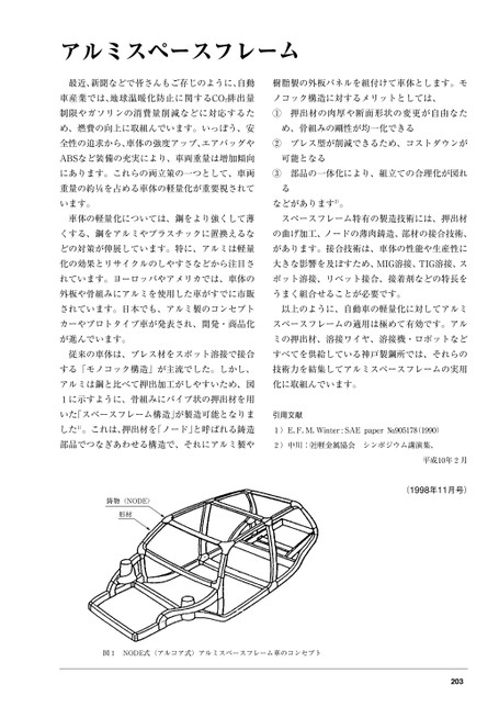 アルミスペースフレーム最近、新聞などで皆さんもご存じのように、自動樹脂製の外板パネルを組付けて車体とします。モ車産業では、地球温暖化防止に関するCO2排出量ノコック構造に対するメリットとしては、制限やガソリンの消費量削減などに対応するた①押出材の肉厚や断面形状の変更が自由なため、燃費の向上に取組んでいます。いっぽう、安め、骨組みの剛性が均一化できる全性の追求から、車体の強度アップ、エアバッグや②プレス型が削減できるため、コストダウンがABSなど装備の充実により、車両重量は増加傾向可能となるにあります。これらの両立策の一つとして、車両重量の約を占める車体の軽量化が重要視されています。③部品の一体化により、組立ての合理化が図れるなどがあります2)。車体の軽量化については、鋼をより強くして薄スペースフレーム特有の製造技術には、押出材くする、鋼をアルミやプラスチックに置換えるなの曲げ加工、ノードの薄肉鋳造、部材の接合技術、どの対策が伸展しています。特に、アルミは軽量があります。接合技術は、車体の性能や生産性に化の効果とリサイクルのしやすさなどから注目さ大きな影響を及ぼすため、MIG溶接、TIG溶接、スれています。ヨーロッパやアメリカでは、車体のポット溶接、リベット接合、接着剤などの特長を外板や骨組みにアルミを使用した車がすでに市販うまく組合せることが必要です。されています。日本でも、アルミ製のコンセプト以上のように、自動車の軽量化に対してアルミカーやプロトタイプ車が発表され、開発・商品化スペースフレームの適用は極めて有効です。アルが進んでいます。ミの押出材、溶接ワイヤ、溶接機・ロボットなど従来の車体は、プレス材をスポット溶接で接合すべてを供給している神戸製鋼所では、それらのする「モノコック構造」が主流でした。しかし、技術力を結集してアルミスペースフレームの実用アルミは鋼と比べて押出加工がしやすいため、図化に取組んでいます。1に示すように、骨組みにパイプ状の押出材を用いた「スペースフレーム構造」が製造可能となりま引用文献した1)。これは、押出材を「ノード」と呼ばれる鋳造1)E.F.M.Winter:SAEpaper№9051781990)部品でつなぎあわせる構造で、それにアルミ製や2)中川:軽金属協会シンポジウム講演集、平成10年2月(1998年11月号)鋳物(NODE)形材図1NODE式(アルコア式)アルミスペースフレーム車のコンセプト203