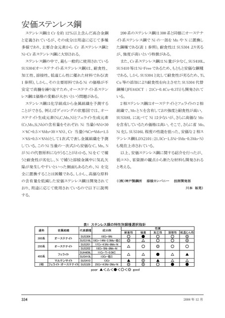 安価ステンレス鋼ステンレス鋼はCrを約12%以上含んだ高合金鋼200系のステンレス鋼は300系と同様にオーステナと定義されているが、その成分は用途に応じて多種イト系ステンレス鋼でNiの一部をMnやNに置換し多様であり、主要合金元素からCr系ステンレス鋼とた鋼種である(表1参照)。耐食性はSUS304より劣るNi-Cr系ステンレス鋼に大別される。が、強度が高いという特徴がある。ステンレス鋼の中で、最も一般的に使用されているまた、Cr系ステンレス鋼はNi量が少なく、SUS410L,SUS304(オーステナイト系ステンレス鋼)は、耐食性、SUS410等はNi-Freeであるため、もともと安価な鋼種加工性、溶接性、低温じん性に優れた材料である(表である。しかしSUS304と比して耐食性が劣るため、Ti,1参照)。しかし、その主要原料であるNiの価格が不Cu等の添加により耐食性を向上させたSUS304代替安定で高騰を繰り返すため、オーステナイト系ステン鋼種(JFE443CT:21Cr-0.4Cu-0.3Ti)も開発されてレス鋼は価格の変動が大きいという問題がある。いる。ステンレス鋼は化学組成から金属組織を予測する2相ステンレス鋼はオーステナイトとフェライトの2相ことができる。例えばディロングの状態図では、オー組織で、MoとNを含有しており強度と耐食性が高い。ステナイト生成元素(Ni,C,Mn,N)とフェライト生成元素SUS316Lに比べてNiは少ないが、さらに高価なMo(Cr,Mo,Si,Nb)の含有量をそれぞれNi当量(=%Ni+30を含有しているため価格は高い。そこで、さらに省Mo,×%C+0.5×%Mn+30×%N)、Cr当量(=%Cr+%Mo+1.5Ni化しSUS316L程度の性能を狙った、安価な2相ス×%Si+0.5×%Nb)として1次式で表し金属組織を予測テンレス鋼(LDX2101:21.5Cr-1.5Ni-5Mn-0.3Mo-N)している。このNi当量の一次式から安価なC,Mn,Nも現在上市されている。がNiの代替原料になりうることがわかる。NiをCで補以上、安価ステンレス鋼に関する紹介を行ったが、うと耐食性が劣化し、Nで補うと溶接金属中に気孔欠低コスト、省資源の観点から新たな材料も開発される陥が発生しやすいといった側面もあるため、Niを完と考える。全に置換することは困難である。しかし、高価な原料の含有量を低減した安価ステンレス鋼は開発されて((株)神戸製鋼所溶接カンパニー技術開発部おり、用途に応じて使用されているので以下に説明川本裕晃)表1ステンレス鋼の特性別鋼種選択指針通称金属組織代表鋼種成分例300系オーステナイト200系オーステナイト400系フェライトマルテンサイトSUS30418Cr-9NiSUS316L18Cr-14Ni-2.5Mo-低CSUS201SUS202SUH409LSUS410LSUS41017Cr-4.5Ni-6Mn-N18Cr-5Ni-8Mn-N11Cr-Ti-0.06C13Cr-低C13Cr2相フェライト・オーステナイトSUS32925Cr-4.5Ni-2Mo-N耐食性○◎△△▲◎強度●△○△◎◎poor<▲<△<●<○<◎goodod性質加工性溶接性低温じん性○○◎●▲○○○○△△●◎◎○▲△●2008年12月する。343