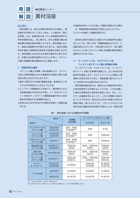 用解語説●知恵袋コーナー異材溶接はじめに異材溶接とは、異なる材質の母材同士を溶接し、異材継手を作製することをいいます。この場合の「異なる材質」とは、金属材料が持っている物理的性質や化学的性質等を指し、同じ鋼でも、例えば高張力鋼と耐候性鋼の溶接は異材溶接となります。異材溶接において、健全な溶接継手を作製するためには、適切な溶接材料の選定と溶接条件(希釈率)の管理が必要になります。異材溶接にはさまざまな母材の組合せがありますが、本稿では比較的適用されることが多い、ステンレス鋼と炭素鋼の異材溶接を中心に解説します。1.溶接材料の選定ステンレス鋼と炭素鋼・低合金鋼および、ステンレス同士の異材溶接における溶接材料の選定に関する基本的な考え方は以下のとおりです。①継手に要求される性能(機械的性能、耐食性など)がどちらかの母材以上になるようにする。②シェフラーの組織図などを用いて、異材継手における溶接金属の化学成分を予測し、2〜20%のフェライトを含むオーステナイト鋼溶接金属が得られる溶接材料を選定する(高温割れ防止)。③母材HAZに対するPWHTの要否を考慮して候補を選定する。④溶接物が熱サイクルの激しい環境で使用される場合は、熱膨張係数が両母材の中間となるようにする。⑤コストも考慮して候補を選定する。具体的な母材の組合せと選定される溶接材料の組合せについては、表1に示す「神鋼溶接総合カタログ」に記載の表のとおりです。今回は表1の中から、特に適用されることが多いステンレス鋼と炭素鋼の異材溶接の説明を以下に述べます。1-1.オーステナイト系、マルテンサイト系、フェライト系ステンレス鋼と炭素鋼の溶接オーステナイト系、マルテンサイト系、フェライト系ステンレス鋼と炭素鋼の溶接には、主に309系の溶接材料を適用します。マルテンサイトによる硬化と高温割れの発生を防ぐために、溶接金属に数%のフェライトを含有させる必要があるためです。異材溶接金属の成分は、母材および溶接材料の成分と母材希釈率から計算することができ、これを逆算して適正な溶接材料と希釈率を選定します。また、シェフラーの組織を用いることで、これらを簡便に推定することができます。例えばSUS304と軟鋼(SS400)の溶接の場合、図1に示すように、プロットされた2つの母材を結ぶ直線を相対希釈率で案分した点(同等の場表1異材溶接における溶接材料の種類母材B※1オーステナイト系ステンレス鋼フェライト系ステンレス鋼マルテンサイト系ステンレス鋼省合金型二相ステンレス鋼汎用二相ステンレス鋼スーパー二相ステンレス鋼母材A※1SUS304SUS316LSUS409LSUS430SUS410SUS821L1SUS323LSUS329J3LSUS327L1スーパーオーステナイトSUS312LSUS836L炭素鋼低合金鋼309,309LNi6082※2309,309LNi6082※2309,309LNi6082※2309LMo2209309LMo2209309LMo329J4LNi6625オーステナイト系ステンレス鋼SUS304SUS316L308309309309L,309LMo2209309L,309LMo2209309L,309LMo329J4L309LMoNi6625316L309LMo309LMo309LMo2209309LMo2209309LMo329J4LNi6625Ni6276ニッケル合金NCF625Ni6625Ni6625Ni6625NW0276Ni6276Ni6276Ni6276※1JISG4305,JISG4902など※2約400℃以上の熱サイクルを受ける場合はニッケル合金を使用します。112023Spring