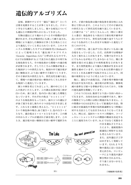 遺伝的アルゴリズム近頃、新聞やテレビで“遺伝”遺伝子”というます。子孫の染色体は親の染色体を部分的に入れ言葉を見聞きすることが多くなりました。クロー替えて得られます。このようにしてその子孫が次ン羊なども誕生しましたし、様々な病気についての世代となって世代交代を繰り返していきます。も遺伝との関係が明らかになってきました。この湖では“1”がたくさん入った(特に1番目生物は遺伝により親から子へとその特徴が受けと4番目)染色体をもつ魚ほど子孫を残す確率が継がれます。それが幾世代にも渡って繰り返され、高いわけですから、世代交代を繰り返すうちにそ環境により適合した個体ほど多く生き残ることにのような魚がたくさん存在する集団へと進化してより進化していくと考えられています。このメカ行くわけです。ニズムを模擬したモデルが1960年代にHollandらこの例では、速く泳げて白い魚がいつも高い適によって提唱された“遺伝的アルゴリズム合度をもっていました。ただ、自然界では環境が(GeneticAlgorithm:GA)”と呼ばれるものです。大きく変わることがあります。生物ではそのときGAでは各個体が{0,1}で表された遺伝子の列であにでもみんなが死んでしまわないように、種に多る染色体をもち、その染色体から環境への適合度様性を保たせる遺伝子の突然変異などがありまが計算されます。そしてたくさんの個体が集まっす。また突然変異により優れた個体が生まれる可た集団が1つの世代となり、集団の中で適合度が能性も秘めています。GAでもある位置の遺伝子高い個体ほど、より高い確率で子孫をつくります。の0と1をある確率で反転させることにより、同その子孫が次の世代となり、世代交代を繰り返し様の効果をもつように考えられています。て、環境への適合度が高い個体がたくさん存在す他に、遺伝子の表現方法、子孫を残す個体の選る集団へと進化していきます。択方法や交叉の仕方、適合度の計算方法、個体死図1の例を考えてみましょう。湖の中にたくさ滅の基準など様々な事柄が考えられており、生物んの魚がいたとします。この湖は水深が浅く砂がの進化過程を模擬しています。白いため、速く泳ぎ、色の白い魚に適した環境とこのようにGAは、集団でより良い方向へ向かっなっています。それぞれの魚は“010110”て行きます。方向を決めるのは確率であり、個々のような染色体をもっており、前の3つの遺伝子の個体どうしの間には特に関連がありません。こが泳ぐ速さを表し後ろの3つは色の白さを表しまの特徴からGAは近年になって最適化の方法、特す。これらを2進数と考えると、“010110”に組合せ最適化や多数の局所最適解をもつ問題にという染色体の場合、泳ぐ速さ=2,色の白さ=6対する方法としても注目されるようになってきまとなり、適合度は2+6=8となります。この湖した。例えば、巡回セールスマン問題や、コージの中からカップルが選ばれ子孫を残します。このェネレーションシステムの機器の構成を決定するとき、適合度の高い個体ほど高い確率で選択されことに適用されています。0,1}ではなく実数をそ染色体0101102+6=8適合度適合度計算選択010110Daddy交叉Children011010101001Mummy100101図1のまま遺伝子とすることにより、連続変数の最適化に利用する方法も考えられています。また、近年遺伝子工学はめざましく発展しています。GAもより生物の進化に近い方法が考え出され、コンピュータにより進化の謎が解き明かされるのも、そう遠くはないかもしれません。(1998年10月号)205