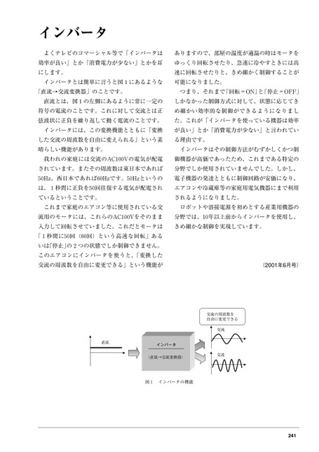 インバータよくテレビのコマーシャル等で「インバータはありますので、部屋の温度が適温の時はモータを効率が良い」とか「消費電力が少ない」とかを耳ゆっくり回転させたり、急速に冷やすときには高にします。速に回転させたりと、きめ細かく制御することがインバータとは簡単に言うと図1にあるような可能になりました。「直流→交流変換器」のことです。つまり、それまで「回転=ON」と「停止=OFF」直流とは、図1の左側にあるように常に一定のしかなかった制御方式に対して、状態に応じてき符号の電流のことです。これに対して交流とは正め細かい効率的な制御ができるようになりまし弦波状に正負を繰り返して動く電流のことです。た。これが「インバータを使っている機器は効率インバータには、この変換機能とともに「変換が良い」とか「消費電力が少ない」と言われていした交流の周波数を自由に変えられる」という素る理由です。晴らしい機能があります。インバータはその制御方法がむずかしくかつ制我われの家庭には交流のAC100Vの電気が配電御機器が高価であったため、これまである特定のされています。またその周波数は東日本であれば分野でしか使用されていませんでした。しかし、50Hz、西日本であれば60Hzです。50Hzというの電子機器の発達とともに制御回路が安価になり、は、1秒間に正負を50回往復する電気が配電されエアコンや冷蔵庫等の家庭用電気機器にまで利用ているということです。されるようになりました。これまで家庭のエアコン等に使用されている交ロボットや溶接電源を初めとする産業用機器の流用のモータには、これらのAC100Vをそのまま分野では、10年以上前からインバータを使用し、入力して回転させていました。これだとモータはきめ細かな制御を実現しています。「1秒間に50回(60回)という高速な回転」あるいは「停止」の2つの状態でしか制御できません。このエアコンにインバータを使うと、「変換した交流の周波数を自由に変更できる」という機能が(2001年6月号)交流の周波数を自由に変更できる交流交流直流インバータ(直流→交流変換器)図1インバータの機能241