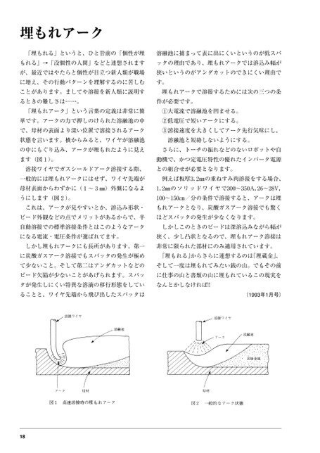 埋もれアーク「埋もれる」というと、ひと昔前の「個性が埋溶融池に捕まって表に出にくいというのが低スパもれる」→「没個性の人間」などと連想されますッタの理由であり、埋もれアークでは溶込み幅がが、最近ではやたらと個性が目立つ新人類が職場狭いというのがアンダカットのできにくい理由でに増え、その行動パターンを理解するのに苦しむす。ことがあります。ましてや溶接を新人類に説明す埋もれアークで溶接するためには次の三つの条るときの難しさは……。件が必要です。「埋もれアーク」という言葉の定義は非常に簡①大電流で溶融池を凹ませる。単です。アークの力で押しのけられた溶融池の中②低電圧で短いアークにする。で、母材の表面より深い位置で溶接されるアーク③溶接速度を大きくしてアーク先行気味にし、状態を言います。横からみると、ワイヤが溶融池溶融池と短絡しないようにする。の中にもぐり込み、アークが埋もれたように見えさらに、トーチの振れなどのないロボットや自ます(図1)。動機で、かつ定電圧特性の優れたインバータ電源溶接ワイヤでガスシールドアーク溶接する際、との組合せが必要となります。一般的には埋もれアークにはせず、ワイヤ先端が例えば板厚3.2㎜の重ねすみ肉溶接をする場合、母材表面からわずかに(1〜3㎜)外側になるよ1.2㎜のソリッドワイヤで300〜350A,26〜28V,うにします(図2)。100〜150㎝/分の条件で溶接すると、アークは埋これは、アークが見やすいとか、溶込み形状・もれアークとなり、炭酸ガスアーク溶接でも驚くビード外観などの点でメリットがあるからで、半ほどスパッタの発生が少なくなります。自動溶接での標準溶接条件とはこのようなアークしかしこのときのビードは深溶込みながら幅がになる電流・電圧条件が選ばれてます。狭く、少し凸状となるので、埋もれアーク溶接はしかし埋もれアークにも長所があります。第一非常に限られた部材にのみ適用されています。に炭酸ガスアーク溶接でもスパッタの発生が極め「埋もれる」からさらに連想するのは「埋蔵金」、て少ないこと。そして第二はアンダカットなどのそして一度は埋もれてみたい銭の山。でもその前ビード欠陥が少ないことがあげられます。スパッに仕事の山と書類の山に埋もれているこの現実をタが発生しにくい特異な溶滴の移行形態をしていなんとかしなければ!!ることと、ワイヤ先端から飛び出したスパッタは(1993年1月号)18