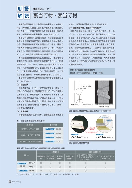 用解語説●知恵袋コーナー裏当て材・表当て材溶接用の副資材として使用される裏当て材・表当て材は、鉄骨仕口の裏当て金などの金属系と片面溶接における裏ビード形成を目的とした非金属系に分類されます。今回は後者の非金属系について記載します。裏当て材を使用する片面溶接は、突合せ溶接における裏はつり工程を省略でき、能率向上につながることから、造船所を中心に広く適用されています。裏当て材の構成や取扱方法はさまざまであり、表1、表2に示すように、適用する溶接法や溶接材料、部材の状況などにより、適したものを選定する必要があります。横向溶接最終層の垂れ防止を目的とし、表当て材も使用されています。表当て材の使用方法とビード形状の一例を図1に示します。横向溶接の最終層は1パス目のビード形状が重要です。表当て材を用いることにより、2パス目以降の積み上げがしやすい良好なビード形状が容易に得られ、その後の積層も容易になります。裏当て材を使用する片面溶接における留意事項を以下にまとめます。(1)開先形状開先角度やルートギャップが狭すぎると、裏ビードが出にくくなります。溶接電流を上げる、アークを突っ込ませるなど、無理に裏ビードを出そうとすると、高温割れや融合不良のリスクが高まります。ルートフェイスがある場合も同様です。反対にルートギャップが広すぎると、裏当て材を多く融かしてしまい、裏ビードが過大となります。(2)溶接条件溶接電流が過大であったり、溶接速度が速すぎたり表1溶接法と対応する裏当て材溶接法裏当て材サブマージアーク溶接ガスシールドアーク溶接エレクトロガスアーク溶接FA-B1FB-B3FR-B3KL-4すると、高温割れが発生することがあります。(3)鋼板表面状態、裏当て材の取扱い開先内に錆や水分、油などがあるとブローホール、ピット、ポックマークなどの欠陥が発生することがあります。裏当て材についても、雨に濡れたものや結露したものを使用すると、同様の欠陥が発生する可能性があるため、保管方法には留意する必要があります。また、溶接中の剥落や裏ビード形状の不良を防ぐため、裏当て材取付け部は錆、油などを除去し、裏当て材のセンターをルート中央に合わせる必要があります。極厚板のエレクトロガスアーク溶接など、大入熱で使用する場合は、当て金とくさびなどによるバックアップが推奨されます。(株)神戸製鋼所溶接事業部門技術センター溶接開発部榊山一規セラミック製耐火物両面テープアルミテープ※最終層1パス目図1表当て材の使用方法およびビード形状一例ガラステープ両面粘着テープセラミック製耐火物アルミテープFB-B3TサイズFB-B3Aサイズ図2裏当て材外観一例表2ガスシールドアーク溶接用裏当て材の種類と特長使用特性組合せ溶接材料品名耐目違い性曲がり部への適用切断の容易さ取付けの簡便さソリッドワイヤおよびフラックス入りワイヤ(MXシリーズ)フラックス入りワイヤ(DWシリーズ)FB-B3TサイズAサイズFR-B3□○◎○○◎◎○○◎◎○□◎○◎:非常に優れている○:優れている□:普通△:やや劣る×:劣る◎○△192021Spring