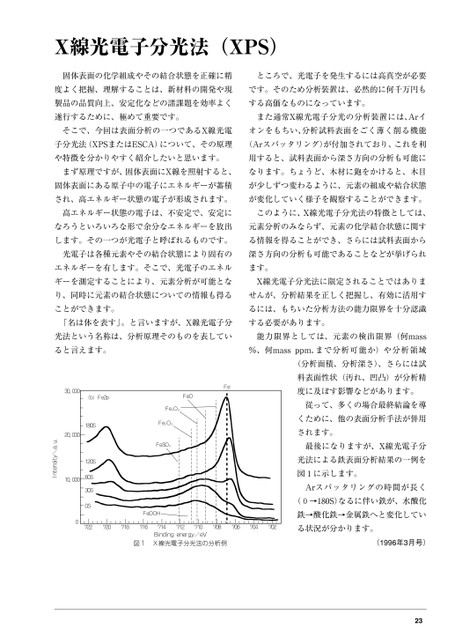 X線光電子分光法(XPS)固体表面の化学組成やその結合状態を正確に精ところで、光電子を発生するには高真空が必要度よく把握、理解することは、新材料の開発や現です。そのため分析装置は、必然的に何千万円も製品の品質向上、安定化などの諸課題を効率よくする高価なものになっています。遂行するために、極めて重要です。また通常X線光電子分光の分析装置には、Arイそこで、今回は表面分析の一つであるX線光電オンをもちい、分析試料表面をごく薄く削る機能子分光法(XPSまたはESCA)について、その原理(Arスパッタリング)が付加されており、これを利や特徴を分かりやすく紹介したいと思います。用すると、試料表面から深さ方向の分析も可能にまず原理ですが、固体表面にX線を照射すると、なります。ちょうど、木材に鉋をかけると、木目固体表面にある原子中の電子にエネルギーが蓄積が少しずつ変わるように、元素の組成や結合状態され、高エネルギー状態の電子が形成されます。が変化していく様子を観察することができます。高エネルギー状態の電子は、不安定で、安定にこのように、X線光電子分光法の特徴としては、なろうといろいろな形で余分なエネルギーを放出元素分析のみならず、元素の化学結合状態に関すします。その一つが光電子と呼ばれるものです。る情報を得ることができ、さらには試料表面から光電子は各種元素やその結合状態により固有の深さ方向の分析も可能であることなどが挙げられエネルギーを有します。そこで、光電子のエネルます。ギーを測定することにより、元素分析が可能となX線光電子分光法に限定されることではありまり、同時に元素の結合状態についての情報も得るせんが、分析結果を正しく把握し、有効に活用すことができます。るには、もちいた分析方法の能力限界を十分認識「名は体を表す」。と言いますが、X線光電子分する必要があります。光法という名称は、分析原理そのものを表してい能力限界としては、元素の検出限界(何massると言えます。%、何massppm.まで分析可能か)や分析領域FeFeO(分析面積、分析深さ)、さらには試料表面性状(汚れ、凹凸)が分析精度に及ぼす影響などがあります。従って、多くの場合最終結論を導くために、他の表面分析手法が併用されます。最後になりますが、X線光電子分光法による鉄表面分析結果の一例を図1に示します。Arスパッタリングの時間が長く(0→180S)なるに伴い鉄が、水酸化鉄→酸化鉄→金属鉄へと変化してい708706704702る状況が分かります。()bFe2p180S120S60S30S0SFe3O4Fe2O3FeSO4FeOOH30,00020,000.u10,000.a/Intensty0722720718716図1714712energy710/BindingX線光電子分光法eVの分析例(1996年3月号)23