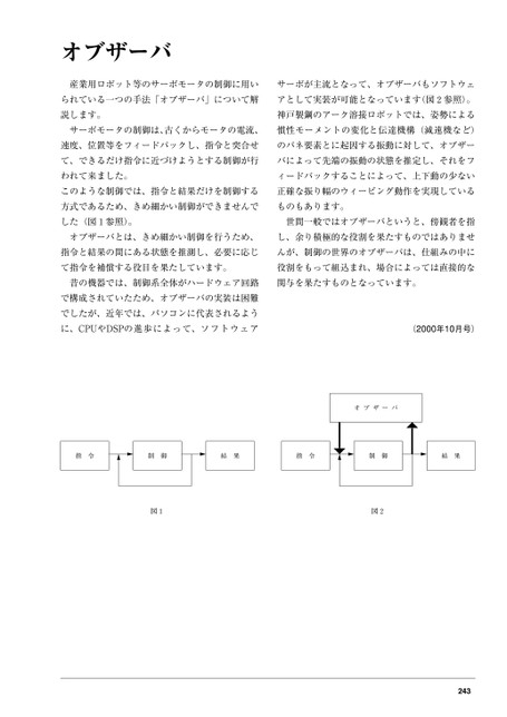 オブザーバ産業用ロボット等のサーボモータの制御に用いサーボが主流となって、オブザーバもソフトウェられている一つの手法「オブザーバ」について解アとして実装が可能となっています(図2参照)。説します。神戸製鋼のアーク溶接ロボットでは、姿勢によるサーボモータの制御は、古くからモータの電流、慣性モーメントの変化と伝達機構(減速機など)速度、位置等をフィードバックし、指令と突合せのバネ要素とに起因する振動に対して、オブザーて、できるだけ指令に近づけようとする制御が行バによって先端の振動の状態を推定し、それをフわれて来ました。ィードバックすることによって、上下動の少ないこのような制御では、指令と結果だけを制御する正確な振り幅のウィービング動作を実現している方式であるため、きめ細かい制御ができませんでものもあります。した(図1参照)。世間一般ではオブザーバというと、傍観者を指オブザーバとは、きめ細かい制御を行うため、し、余り積極的な役割を果たすものではありませ指令と結果の間にある状態を推測し、必要に応じんが、制御の世界のオブザーバは、仕組みの中にて指令を補償する役目を果たしています。役割をもって組込まれ、場合によっては直接的な昔の機器では、制御系全体がハードウェア回路関与を果たすものとなっています。で構成されていたため、オブザーバの実装は困難でしたが、近年では、パソコンに代表されるように、CPUやDSPの進歩によって、ソフトウェア(2000年10月号)オブザーバ指令制御結果指令制御結果図1図2243