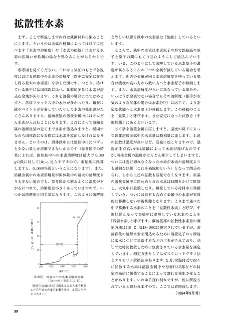 拡散性水素まず、ここで解説します内容は鉄鋼材料に限ることと等しい状態を鉄中の水素量は「飽和」しているといにします。というのは金属の種類によっては以下に述います。べます「水素の溶解度」や「水素の拡散」における水ところで、鉄中の水素は水素原子の形で鉄結晶の原素の振舞いが鉄鋼の場合と異なることがあるからで子と原子の間にもぐり込むようにして溶込んでいます。す。いま、このようにして溶解している水素原子の濃参考図を見てください。これは1気圧のもとで各温度が異なるところの二つの金属が接している場合を考えます。両者の金属が同じ水素溶解度を持っている場定度における純鉄中の水素の溶解度(鉄中に安に存在し得る最大の水素量)を示した図です。つまり、溶け合は濃度の高い方から低い方へと水素原子が移動しまている鉄中には固体鉄に比べ、比較的多量に水素が溶す。また、水素溶解度が互いに異なっている場合や、込む余地があります。これを溶接の場合に当てはめまいっぽうが金属でない場合でもその溶解度(相手が空すと、溶接フラックス中の水分が多かったり、鋼板に気のような気体の場合は水素分圧)に応じて、より安錆やペイントが付着していたりして水素の発生源がた定な状態へと水素原子が移動します。この移動のことくさんありますと、溶融状態の溶接金属中にはどんどを「拡散」と呼びます。また安定になった状態を「平ん水素が入込むことになります。これによって溶融金衡状態」にあるといいます。属の溶解度量の近くまで水素が溶込みますと、凝固すさて話を溶接金属に戻しますと、温度の降下によっなわち固体鉄になる際には水素を放出しなければなりて固体溶接金属中の水素量は飽和量に達します。上述ません。というのは、固体鉄中には溶鉄中に比べずっの拡散は温度が高いほど、活発に起こりますので、温と少ない量しか溶解できないからです(参考図での結度がまだ高い内は拡散によって水素が逃げるのです果によれば、固体鉄中への水素溶解度は最大でも100が、溶接金属の温度がどんどん降下してしまいますと、gの鉄に対して10c.c.足らずですので、重量比に換算ついには逃げ切れなくなった水素が水素の溶解度よりしますと、0.0009%弱ということになります)。また、も過剰な状態(これを過飽和という)となって閉込め溶融金属中の水素溶解量が固体鉄中の最大の溶解度よられ、しかも上述の拡散も活発でなくなります。室温りも少ない場合でも、参考図から解るように温度が下の溶接金属中に閉込められた水素は時間をかけて拡散がるにつれて、溶解度は小さくなっていますので、いし、大気中に放散したり、隣接している母材中に移動つかは溶解度と同じ量になります。このように溶解度していき、ついには母材も含めて金属中の水素が実質的に移動しない平衡状態となります。これまで述べた中で移動する水素のことを「拡散性水素」と呼び、平衡状態となって金属中に溶解している水素のことを「残留水素」と呼びます。鋼溶接部の拡散性水素量の測定方法はJISZ3118―1992に規定されていますが、溶接直後の溶解水素を閉込めるために溶接完了の5秒後に氷水につけて急冷するなどの工夫がされており、45℃で72時間放置した時に放出されている水素量を測定しています。測定方法としてはガスクロマトグラフ法とグリセリン置換法があります。なお、常温付近で徐々に拡散する水素は溶接金属中や母材HAZ部などの特定の場所に集積することによって割れを発生させることがあります。いわゆる遅れ割れですが、他に解説されていると思われますので、ここでは省略致します。(1984年9月号)30