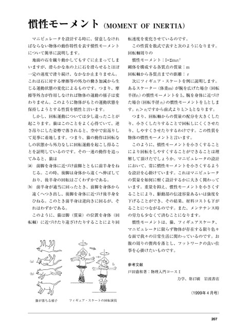 慣性モーメント(MOMENTOFINERTIA)マニピュレータを設計する時に、留意しなけれ転速度を変化させているのです。ばならない物体の動作特性を表す慣性モーメントこの性質を数式で表すと次のようになります。について簡単に説明します。回転軸周りの地面の石を蹴り動かしてもすぐに止まってしま慣性モーメント:I=Σmiri2いますが、滑らかな氷の上に石を滑らせるとほぼ剛体を構成する各質点の質量:m一定の速度で滑り続け、なかなか止まりません。回転軸から各質点までの距離:rこれは石に対する摩擦等の外力の働き加減から生次にフィギュア・スケートを例に説明します。じる運動状態の変化によるものです。つまり、摩あるスケーター(体重m)が腕を広げた場合(回転擦等外力が作用しなければ物体の運動の様子は変半径r1)の慣性モーメントをI1,腕を身体に近づけわりません。このように物体がもとの運動状態をた場合(回転半径r2)の慣性モーメントをI2としま保持しようとする性質を慣性と言います。す。r1>r2ですから前式よりI1>I2となります。しかし、回転運動については少し違ったことがつまり、回転軸からの質量の配分を大きくした起こります。猫はこのことをよく心得ていて、逆り、小さくしたりすることで回転しにくくさせたさ吊りにした姿勢で落されると、空中で宙返りしり、しやすくさせたりするわけです。この性質をて見事に着地します。つまり、猫の動作は回転な物体の慣性モーメントと言います。しの状態から外力なしに回転運動を起こし得るここのように、慣性モーメントを小さくすることとを証明しているのです。その一連の動作を追っにより回転をしやすくすることができることは理てみると、猫は前脚を身体に近づけ前脚とともに前半身をね解して頂けたでしょうか。マニピュレータの設計において、常に慣性モーメントを小さくするようじる。この時、後脚は身体から遠くへ伸ばしてな設計を心掛けています。これはマニピュレータおり、後半身の回転はごくわずかである。の質量を如何に軽く設計するかに大きく関わって前半身が適当に回ったとき、前脚を身体からいます。重量を抑え、慣性モーメントを小さくす遠くへつき出し、後脚を身体に近づけ後半身をることにより、駆動部の伝達容量あるいは強度をひねる。このとき前半身は逆向きに回るが、そ下げることができ、その結果、材料コストも下がれはわずかである。ることにつながるのです。また、メンテナンス時このように、猫は脚(質量)の位置を身体(回の労力も少なくて済むことになります。転軸)に近づけたり遠ざけたりすることにより回慣性モーメントは、猫、フィギュアスケータ、I1(a)(b)マニピュレータに限らず物体が存在する限り色々な面で我々の日常生活に関わっているのです。お腹の周りの贅肉を落とし、フットワークの良い仕事を心掛けたいものです。I2参考文献戸田盛和著:物理入門コースⅠ猫が落ちる様子フィギュア・スケートの回転演技力学、第17刷岩波書店(1999年4月号)207