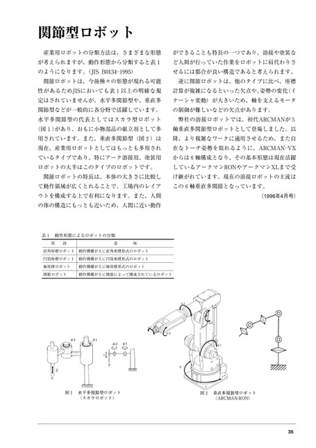 関節型ロボット産業用ロボットの分類方法は、さまざまな形態ができることも特長の一つであり、溶接や塗装なが考えられますが、動作形態から分類すると表1ど人間が行っていた作業をロボットに肩代わりさのようになります。(JISB0134―1995)せるには都合が良い構造であると考えられます。関節ロボットは、今後種々の形態が現れる可能逆に関節ロボットは、他のタイプに比べ、座標性があるためJISにおいても表1以上の明確な規計算が複雑になるといった欠点や、姿勢の変化(イ定はされていませんが、水平多関節型や、垂直多ナーシャ変動)が大きいため、軸を支えるモータ関節型などが一般的に各分野で活躍しています。の制御が難しいなどの欠点があります。水平多関節型の代表としてはスカラ型ロボット弊社の溶接ロボットでは、初代ARCMANが5(図1)があり、おもに小物部品の組立用として多軸垂直多関節型ロボットとして登場しました。以用されています。また、垂直多関節型(図2)は降、より複雑なワークに適用させるため、また自現在、産業用ロボットとしてはもっとも多用され在なトーチ姿勢を取れるように、ARCMAN―VXているタイプであり、特にアーク溶接用、塗装用からは6軸構成となり、その基本形態は現在活躍ロボットの大半はこのタイプのロボットです。しているアークマンRONやアークマンXLまで受関節ロボットの特長は、本体の大きさに比較しけ継がれています。現在の溶接ロボットの主流はて動作領域が広くとれることで、工場内のレイアこの6軸垂直多関節となっています。ウトを構成する上で有利になります。また、人間の体の構造にもっとも近いため、人間に近い動作(1996年4月号)表1動作形態によるロボットの分類用語直角座標ロボット円筒座標ロボット極座標ロボット関節ロボット意味動作機構が主に直角座標形式のロボット動作機構が主に円筒座標形式のロボット動作機構が主に極座標形式のロボット動作機構されているロボットが主に関節によって構成35