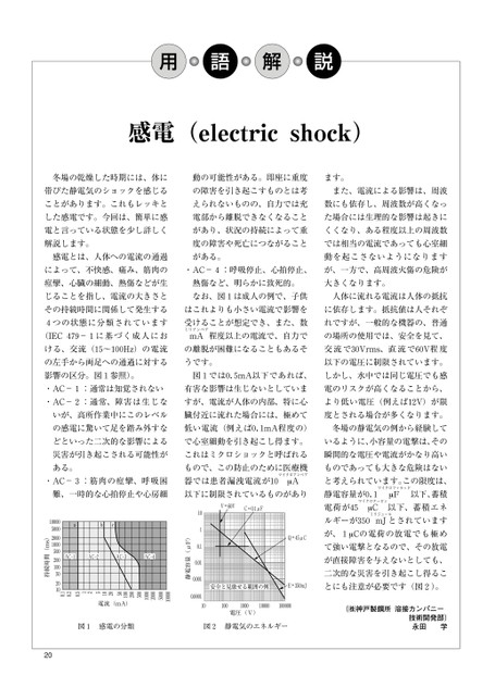 用語解説感電(electricshock)冬場の乾燥した時期には、体に動の可能性がある。即座に重度ます。帯びた静電気のショックを感じるの障害を引き起こすものとは考また、電流による影響は、周波ことがあります。これもレッキとえられないものの、自力では充数にも依存し、周波数が高くなっした感電です。今回は、簡単に感電部から離脱できなくなることた場合には生理的な影響は起きに電と言っている状態を少し詳しくがあり、状況の持続によって重くくなり、ある程度以上の周波数解説します。度の障害や死亡につながることでは相当の電流であっても心室細感電とは、人体への電流の通過がある。動を起こさないようになりますによって、不快感、痛み、筋肉の・AC-4:呼吸停止、心拍停止、が、一方で、高周波火傷の危険が痙攣、心臓の細動、熱傷などが生熱傷など、明らかに致死的。大きくなります。じることを指し、電流の大きさとなお、図1は成人の例で、子供人体に流れる電流は人体の抵抗その持続時間に関係して発生するはこれよりも小さい電流で影響をに依存します。抵抗値は人それぞ4つの状態に分類されています(IEC479-1に基づく成人にお受けることが想定でき、また、数ミリアンペアmA程度以上の電流で、自力でれですが、一般的な機器の、普通の場所の使用では、安全を見て、ける、交流(15〜100Hz)の電流の離脱が困難になることもあるそ交流で30Vrms、直流で60V程度の左手から両足への通過に対するうです。以下の電圧に制限されています。影響の区分。図1参照)。図1では0.5mA以下であれば、しかし、水中では同じ電圧でも感・AC-1:通常は知覚されない有害な影響は生じないとしていま電のリスクが高くなることから、・AC-2:通常、障害は生じなすが、電流が人体の内部、特に心より低い電圧(例えば12V)が限いが、高所作業中にこのレベル臓付近に流れた場合には、極めて度とされる場合が多くなります。の感電に驚いて足を踏み外すな低い電流(例えば0.1mA程度の)冬場の静電気の例から経験してどといった二次的な影響によるで心室細動を引き起こし得ます。いるように、小容量の電撃は、その災害が引き起こされる可能性がこれはミクロショックと呼ばれる瞬間的な電圧や電流がかなり高いある。・AC-3:筋肉の痙攣、呼吸困難、一時的な心拍停止や心房細以下に制限されているものがあり静電容量が0.1µF以下、蓄積器では患者漏洩電流が10µAと考えられています。この限度は、マイクロファラッドもので、この防止のために医療機ものであっても大きな危険はないマイクロアンペアV=60VC=0.1μFマイクロクーロン電荷が45µC以下、蓄積エネルギーが350mJとされていますミリジュールQ=45μCが、1µCの電荷の放電でも極めて強い電撃となるので、その放電が直接障害を与えないとしても、二次的な災害を引き起こし得るこ安全と見倣せる範囲の例E=350mJとにも注意が必要です(図2)。10100100010000100000電圧(V)(㈱神戸製鋼所溶接カンパニー技術開発部)永田学図1感電の分類図2静電気のエネルギー201010.10.010.001静電容量(μF)0.000110000500020001000500200100502010電流(mA)1250.50.20.12010abcAC―1AC―2AC―3AC―41000050002000100050020010050持続時間(ms)