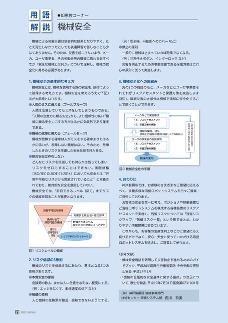 用解語説●知恵袋コーナー機械安全機械による労働災害は致命的な結果となりやすく、たとえ死亡しなかったとしても後遺障害で苦しむことも少なくありません。そのため、災害を起こさないよう、メーカ、ユーザ事業者、その労働者等の機械に携わる者すべてが「安全な機械とは何か」について理解し、機械の安全化に努める必要があります。(例:安全柵、可動部へのカバーなど)●停止の原則一般的に機械は止まっていれば危険でなくなる。(例:非常停止ボタン、インターロックなど)災害を防止するための事前措置である保護方策はこれらの原則に従って実施します。3.機械安全化への取組み先の3つの前提のもと、メーカなどとユーザ事業者それぞれがリスクアセスメントと保護方策を実施します(図2)。機械災害の大部分は機械を適切に安全化することで防ぐことができます。メーカなどの実施事項注文時の条件などの提示使用後に得た知見などの伝達(1)リスクアセスメント(2)保護方策の実施機械の譲渡、貸与使用上の情報の提供(残留リスク情報など)ユーザの事業者の実施事項↓↓(1)リスクアセスメント(2)保護方策の実施機械の使用図2機械安全化の手順4.おわりに神戸製鋼所では、お客様のさまざまなご要望に応えるべく、多種多様な溶接ロボットシステムを日々ご提案・ご提供しております。お客様の安全を第一に考え、ポジショナや移動装置など溶接ロボットシステムを構成する各種装置のリスクアセスメントを実施し、残留リスクについては「残留リスクマップ」「残留リスク一覧」という形でまとめ、わかりやすい情報提供に努めています。これからも、お客様の生産性向上などのご要望に応え続けるだけでなく、安心・安全に使っていただける溶接ロボットシステムを追求し、ご提案して参ります。〈参考文献〉・機械安全規格を活用して災害防止を進めるためのガイドブック,平成26年度厚生労働省委託中央労働災害防止協会,平成27年3月・「機械の包括的な安全基準に関する指針」の改正について,厚生労働省,平成19年7月31日基発第0731001号(株)神戸製鋼所溶接事業部門技術センター溶接システム部西川玖美1.機械安全の基本的な考え方機械安全とは、機械を使用する際の安全を、技術によって確保する考え方です。機械安全を考えるうえで下記3点が大前提となります。●人間のミスに備える(フールプルーフ)人間は注意していてもミスをしてしまうものである。「人間の注意力に頼る安全」から、より信頼性の高い「機械に頼る安全」にする方がはるかに効果的であり確実である。●機械の故障に備える(フェールセーフ)機械が故障する確率は人がミスをする確率よりもはるかに低いが、故障しない機械はない。そのため、故障したときのリスクを考慮した安全性能を持たせる。●絶対安全は存在しないどんなにリスクを低減しても何らかは残ってしまい、リスクをゼロにすることはできない。国際規格(ISO/IECGUIDE51:2014)においても安全とは“許容不可能なリスクから開放されていること”と定義されており、絶対的な安全を意図していない。機械安全では、「許容できるレベル(図1)」までリスクの低減を図ることが重要となります。許容不可能な領域条件付きで許容可能な領域労働安全衛生法=最低基準許容できるレベル国や社会の要請によって変化誰もが許容可能な領域小さな子供向けおもちゃなど図1リスクレベルの領域2.リスク低減の3原則機械のリスクを低減するにあたり、基本となる3つの原則があります。●本質安全の原則危険源の除去、または人に危害を与えない程度にする。(例:エッジをなくす、動作速度の低下など)●隔離の原則人と機械の危険源が接近・接触できないようにする。212023Winter
