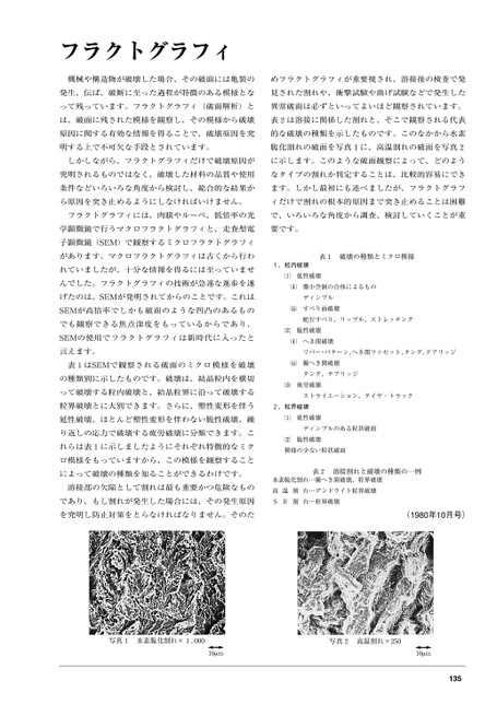 フラクトグラフィ機械や構造物が破壊した場合、その破面には亀裂のめフラクトグラフィが重要視され、溶接後の検査で発発生、伝ぱ、破断に至った過程が特徴のある模様とな見された割れや、衝撃試験や曲げ試験などで発生したって残っています。フラクトグラフィ(破面解析)と異常破面は必ずといってよいほど観察されています。は、破面に残された模様を観察し、その模様から破壊表2は溶接に関係した割れと、そこで観察される代表原因に関する有効な情報を得ることで、破壊原因を究的な破壊の種類を示したものです。このなかから水素明する上で不可欠な手段とされています。脆化割れの破面を写真1に、高温割れの破面を写真2しかしながら、フラクトグラフィだけで破壊原因がに示します。このような破面観察によって、どのよう究明されるものではなく、破壊した材料の品質や使用なタイプの割れか判定することは、比較的容易にでき条件などいろいろな角度から検討し、総合的な結果かます。しかし最初にも述べましたが、フラクトグラフら原因を突き止めるようにしなければいけません。ィだけで割れの根本的原因まで突き止めることは困難フラクトグラフィには、肉眼やルーペ、低倍率の光で、いろいろな角度から調査、検討していくことが重学顕微鏡で行うマクロフラクトグラフィと、走査型電要です。子顕微鏡(SEM)で観察するミクロフラクトグラフィがあります。マクロフラクトグラフィは古くから行わ表1破壊の種類とミクロ模様れていましたが、十分な情報を得るには至っていませんでした。フラクトグラフィの技術が急速な進歩を遂げたのは、SEMが発明されてからのことです。これはSEMが高倍率でしかも破面のような凹凸のあるものでも観察できる焦点深度をもっているからであり、SEMの使用でフラクトグラフィは新時代に入ったと言えます。表1はSEMで観察される破面のミクロ模様を破壊の種類別に示したものです。破壊は、結晶粒内を横切って破壊する粒内破壊と、結晶粒界に沿って破壊する1.粒内破壊延性破壊微小空洞の合体によるものディンプルすべり面破壊蛇行すべり、リップル、ストレッチング脆性破壊へき開破壊リバー・パターン、へき開ファセット、タング、テアリッジ擬へき開破壊タング、テアリッジ疲労破壊ストライエーション、タイヤ・トラック粒界破壊とに大別できます。さらに、塑性変形を伴う2.粒界破壊延性破壊、ほとんど塑性変形を伴わない脆性破壊、繰り返しの応力で破壊する疲労破壊に分類できます。これらは表1に示しましたようにそれぞれ特徴的なミクロ模様をもっていますから、この模様を観察することによって破壊の種類を知ることができるわけです。溶接部の欠陥として割れは最も重要かつ危険なものであり、もし割れが発生した場合には、その発生原因を究明し防止対策をとらなければなりません。そのた延性破壊ディンプルのある粒状破面脆性破壊模様の少ない粒状破面表2溶接割れと破壊の種類の一例水素脆化割れ…擬へき開破壊、粒界破壊高S温R割割れ…デンドライト粒界破壊れ…粒界破壊(1980年10月号)写真1水素脆化割れ×1.000写真2高温割れ×25010µm10µm135