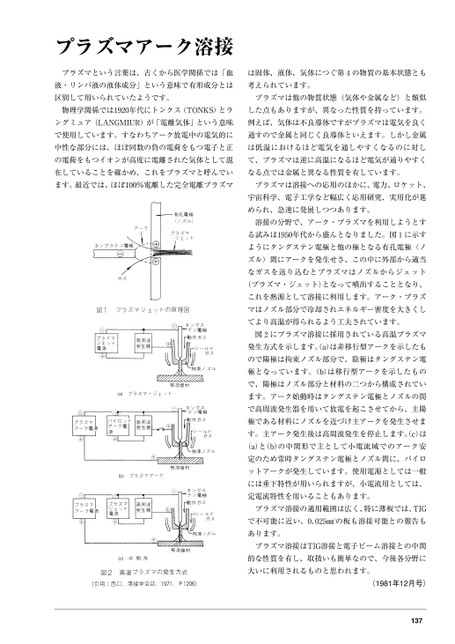 プラズマアーク溶接プラズマという言葉は、古くから医学関係では「血は固体、液体、気体につぐ第4の物質の基本状態とも液・リンパ液の液体成分」という意味で有形成分とは考えられています。区別して用いられていたようです。プラズマは他の物質状態(気体や金属など)と類似物理学関係では1920年代にトンクス(TONKS)とラした点もありますが、異なった性質を持っています。ングミュア(LANGMIUR)が「電離気体」という意味例えば、気体は不良導体ですがプラズマは電気を良くで使用しています。すなわちアーク放電中の電気的に通すので金属と同じく良導体といえます。しかし金属中性な部分には、ほぼ同数の負の電荷をもつ電子と正は低温におけるほど電気を通しやすくなるのに対しの電荷をもつイオンが高度に電離された気体として混て、プラズマは逆に高温になるほど電気が通りやすく在していることを確かめ、これをプラズマと呼んでいなる点では金属と異なる性質を有しています。ます。最近では、ほぼ100%電離した完全電離プラズマプラズマは溶接への応用のほかに、電力、ロケット、宇宙科学、電子工学など幅広く応用研究、実用化が進められ、急速に発展しつつあります。溶接の分野で、アーク・プラズマを利用しようとする試みは1950年代から盛んとなりました。図1に示すようにタングステン電極と他の極となる有孔電極(ノズル)間にアークを発生せさ、この中に外部から適当なガスを送り込むとプラズマはノズルからジェット(プラズマ・ジェット)となって噴出することとなり、これを熱源として溶接に利用します。アーク・プラズマはノズル部分で冷却されエネルギー密度を大きくしてより高温が得られるよう工夫されています。図2にプラズマ溶接に採用されている高温プラズマ発生方式を示します。a)は非移行型アークを示したもので陽極は拘束ノズル部分で、陰極はタングステン電極となっています。(b)は移行型アークを示したもので、陽極はノズル部分と材料の二つから構成されています。アーク始動時はタングステン電極とノズルの間で高周波発生器を用いて放電を起こさせてから、主陽極である材料にノズルを近づけ主アークを発生させます。主アーク発生後は高周波発生を停止します。(c)は(a)と(b)の中間形で主として小電流域でのアーク安定のため常時タングステン電極とノズル間に、パイロットアークが発生しています。使用電源としては一般には垂下特性が用いられますが、小電流用としては、定電流特性を用いることもあります。プラズマ溶接の適用範囲は広く、特に薄板では、TIGで不可能に近い、0.025㎜tの板も溶接可能との報告もあります。プラズマ溶接はTIG溶接と電子ビーム溶接との中間的な性質を有し、取扱いも簡単なので、今後各分野に大いに利用されるものと思われます。(1981年12月号)137