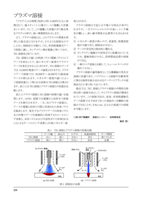 プラズマ溶接「プラズマ」とは物質(気体)が約6,000℃以上に加度となります。熱されて、陽イオン(+)と電子(-)に電離した状態プラズマ溶接は下記に示す様々な利点が挙げらをいいます。そして、この電離した状態のガス集合体れますが、一方でイニシャルコストが高い、トーチ操をプラズマと呼び、高い導電特性を示します。作が難しい、高い継手精度が必要等の欠点もありまさて、プラズマ溶接とは、このプラズマの現象を利用した接合法になりますが、どのような溶接なのでしょうか。溶接法の分類としては、非消耗電極式アーク溶接に属し、タングステン棒を電極に用いており、TIG溶接法と似ています。TIG溶接との違いは拘束ノズル(電極ノズル)にてアークを絞ることで、高エネルギー密度のプラズマアークを発生させることにあります。TIG溶接のアークでは15,000℃程度のアーク温度となりますが、プラズマアーク溶接では30,000℃~40,000℃の超高温アークが得られます。エネルギー密度の違いによって溶接性能として得られる効果はTIG溶接とは異なります。表1にはTIG溶接とプラズマ溶接との性能を比較します。図1にプラズマ溶接とTIG溶接の原理の違いを説明します。(a)TIG溶接では電極から母材まで直接アークを移行させます。一方、(b)プラズマ溶接は、アークが電極と母材との間に冷却された拘束ノズルを経由します。発生するプラズマアークは拘束ノズル孔の内壁でアークを強制的に拘束するウォールピンチ効果と、水冷ノズルおよび不活性ガスで冷却されることによるサーマルピンチ効果により高エネルギー密す。①エネルギー密度が高いので、高速度、低電流溶接が可能であり、溶接歪が少ない。②アークの安定性と指向性に優れる。③タングステン電極が不活性ガスに保護されているため、電極消耗が少なく、長時間高品質の溶接ができる。④一般のマグ溶接と比較して、ヒューム・スパッタが極めて少ない。プラズマ溶接の適用箇所としては薄鋼板の突合せ溶接に好適であり、パイプのシーム溶接や自動車用に異なる板厚を組み合わせるテーラードブランクの溶接法などに多く用いられています。最近では、TIG溶接とプラズマ溶接の中間的な特性を持つ溶接方法として、セミプラズマ溶接が開発されています。この溶接方法は、従来、非消耗電極式アーク溶接では不向きであった亜鉛めっき鋼板の溶接ができることや、0.8m/min以上もの高速での溶接を可能とします。((株)神戸製鋼所溶接カンパニー技術開発部梅原悠)表1TIG溶接とプラズマ溶接の性能比較ビード幅溶込みTIG溶接プラズマ溶接広い狭い浅い深いひずみ大きい少ない高速溶接性劣る良好ワーク精度低くても可必要タングステン電極拘束ノズルタングステン電極プラズマガスシールドノズルシールドガス母材アークシールドノズルシールドガス母材アーク(a)TIG溶接(b)プラズマ溶接図1溶接法の比較293