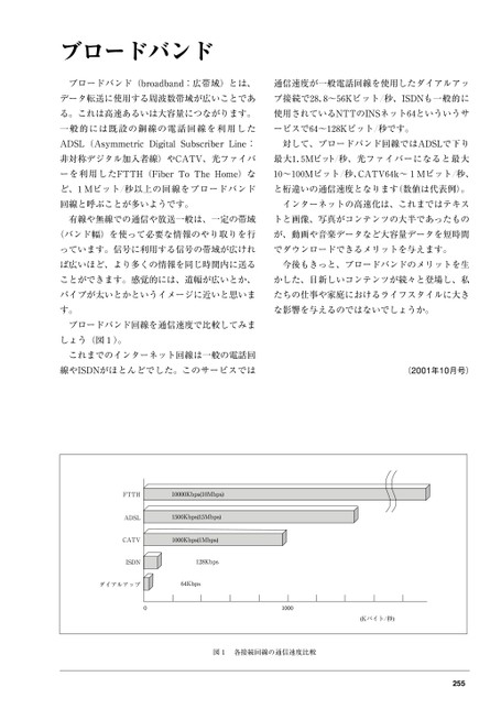ブロードバンドブロードバンド(broadband:広帯域)とは、通信速度が一般電話回線を使用したダイアルアッデータ転送に使用する周波数帯域が広いことであプ接続で28.8〜56Kビット/秒、ISDNも一般的にる。これは高速あるいは大容量につながります。使用されているNTTのINSネット64といういうサ一般的には既設の銅線の電話回線を利用したービスで64〜128Kビット/秒です。ADSL(AsymmetricDigitalSubscriberLine:対して、ブロードバンド回線ではADSLで下り非対称デジタル加入者線)やCATV、光ファイバ最大1.5Mビット/秒、光ファイバーになると最大ーを利用したFTTH(FiberToTheHome)な10〜100Mビット/秒、CATV64k〜1Mビット/秒、ど、1Mビット/秒以上の回線をブロードバンドと桁違いの通信速度となります(数値は代表例)。回線と呼ぶことが多いようです。インターネットの高速化は、これまではテキス有線や無線での通信や放送一般は、一定の帯域トと画像、写真がコンテンツの大半であったもの(バンド幅)を使って必要な情報のやり取りを行が、動画や音楽データなど大容量データを短時間っています。信号に利用する信号の帯域が広けれでダウンロードできるメリットを与えます。ば広いほど、より多くの情報を同じ時間内に送る今後もきっと、ブロードバンドのメリットを生ことができます。感覚的には、道幅が広いとか、かした、目新しいコンテンツが続々と登場し、私パイプが太いとかというイメージに近いと思いまたちの仕事や家庭におけるライフスタイルに大きす。な影響を与えるのではないでしょうか。ブロードバンド回線を通信速度で比較してみましょう(図1)。これまでのインターネット回線は一般の電話回線やISDNがほとんどでした。このサービスでは(2001年10月号)FTTH10000Kbps(10Mbps)ADSL1500Kbps(1.Mbps)CATV1000Kbps(1Mbps)ISDN128Kbpsダイアルアップ64Kbps01000(Kバイト/秒)図1各接続回線の通信速度比較255